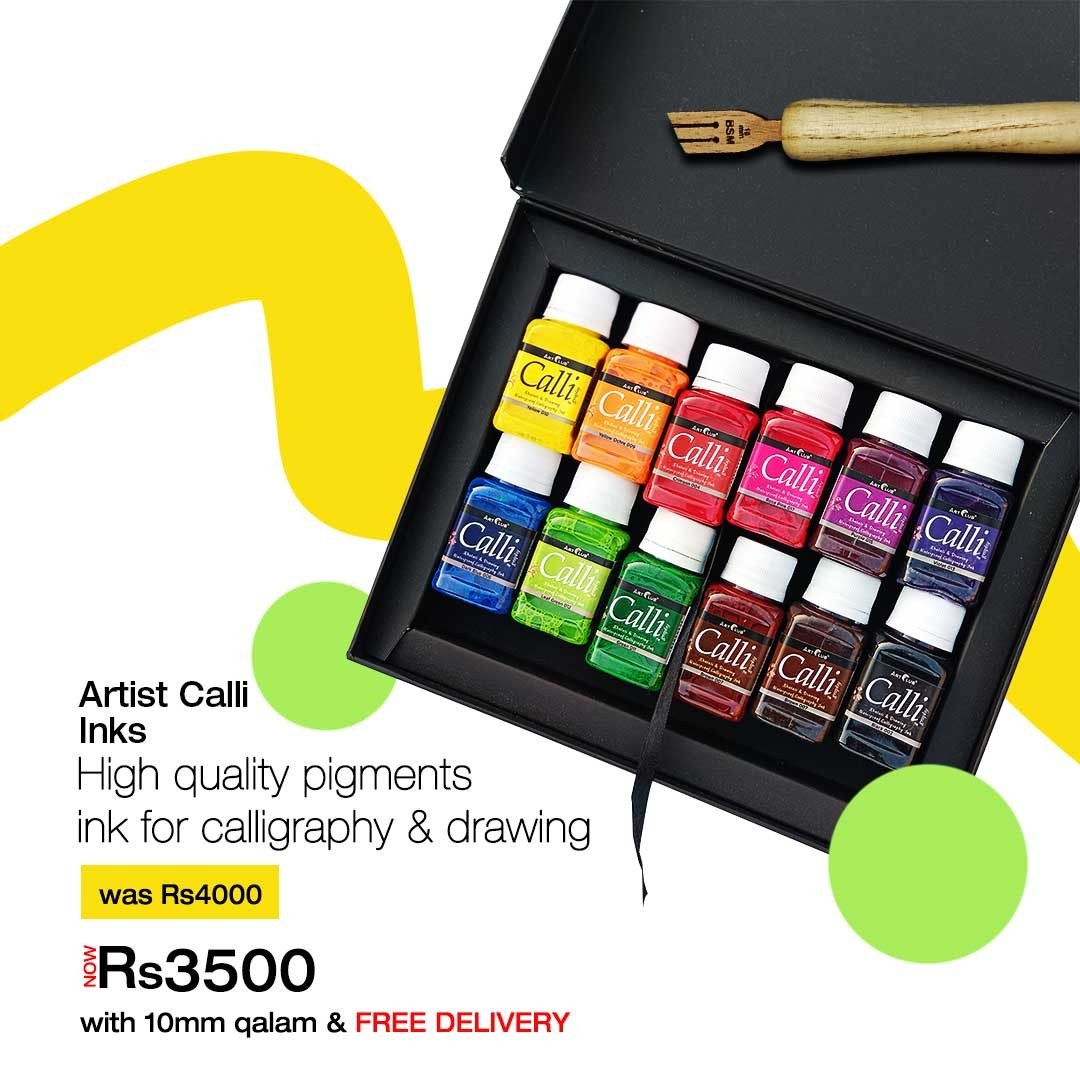 Art Club Calligraphy & Drawing Inks Artist Quality 50ML 12Pcs Pack With 10mm Wooden Dip Qalam