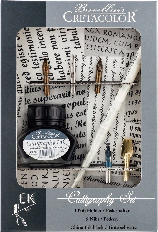 This Calligraphy Set includes 5 different nibs, 1 nib holder in marbled design with special clamp-ever mechanism and 1 jet indian black calligraphy ink bottle of 30ml. The Nibs are categorise in following types: fine writing nib, ornamental nib, poster nib, square-cut nib and italic nib.