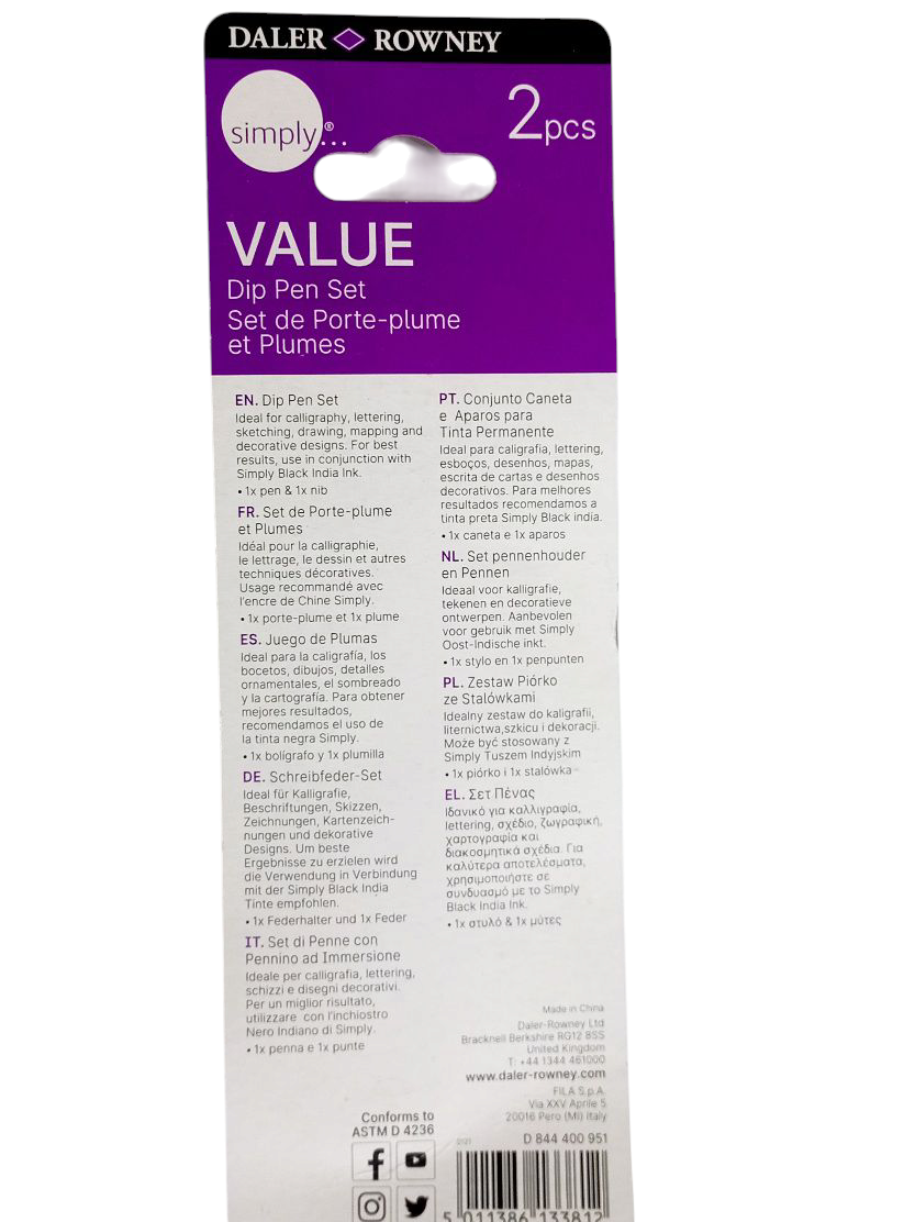 The Daler‑Rowney Value Dip Pen Set includes one sturdy nib holder and a single medium-size nib—perfect for calligraphy, sketching, drawing and decorative line work. Designed for use with India ink, it offers a cost-efficient introduction to dip pen techniques with reliable performance.