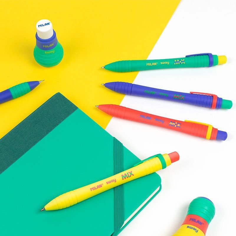 SWAY Mix pen with blue ink. Approximate writing length: 1,000 meters. 1mm tip. Original design created by the MILAN R&D Department. Pen size: 12.8 x 1.4 cm. 1.2 cm Ø. 3 units of various colors: blue, yellow, green and red.