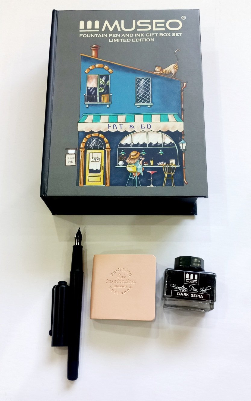 This Fountain Pen box set includes: a stylist book box that contains art materials such as pen & ink, sketch book.