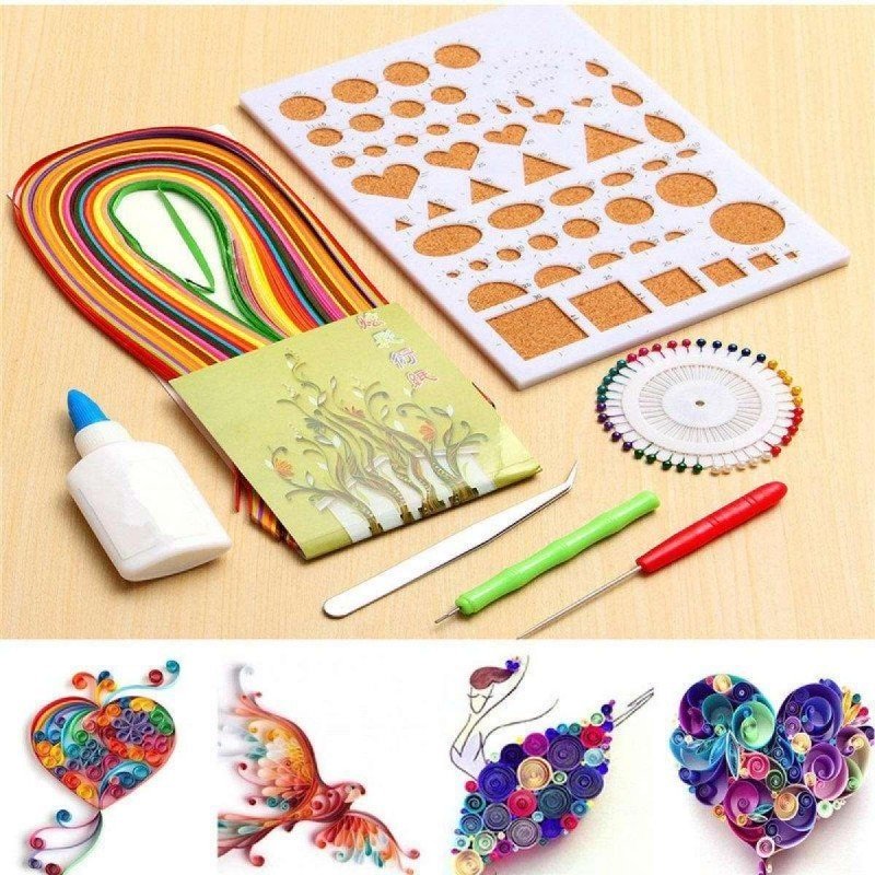 Includes slotted tool, needle tool, fine-tip tweezers, sizer ruler, quilling paper, craft glue, instructions