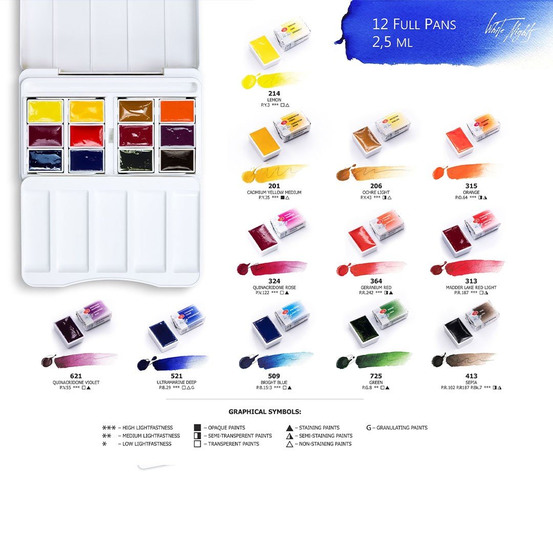 This compact 12-pan set is suitable for use in the studio or for outdoor, plein-air painting. The full-sized pans also makes it easier to pick up colour with brushes of any size. Each set comes packaged with a lightweight plastic palette for convenient colour mixing.
