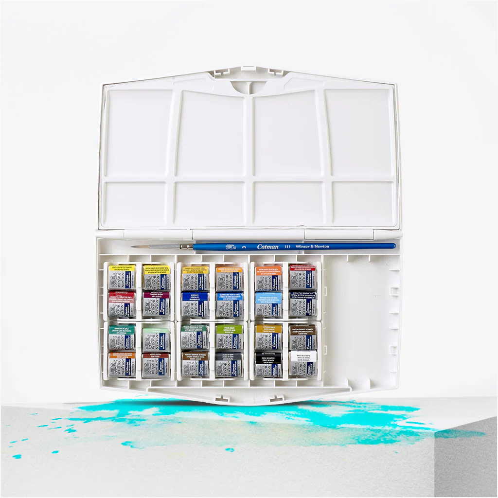 The Cotman Painting PLUS is comprehensive and practical in size, making it suitable for studio or outdoor painting. The Painting PLUS is the ultimate in versatility - it can accommodate both 8ml tubes and half pans, using the PLUS cartridge system which offers great pan security and versatility. This set contains: 24 assorted Cotman Water Color half pans 1 x Cotman Series 111 No.3 brush