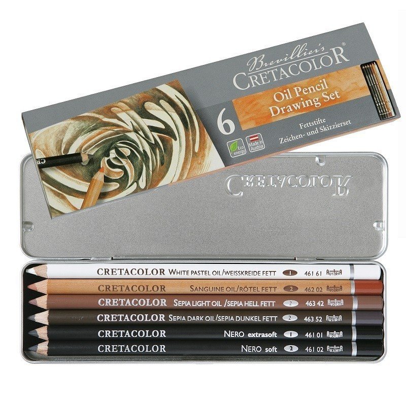 This oil pencil set in tin box comprises an assortment of permanent, oil-based artists’ pencils suitable for drawing and sketching.