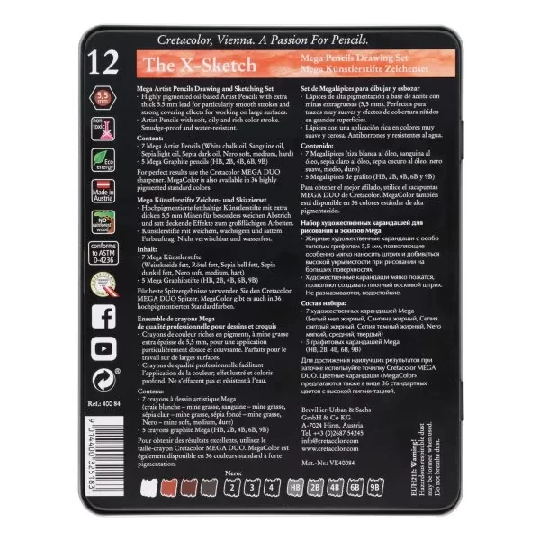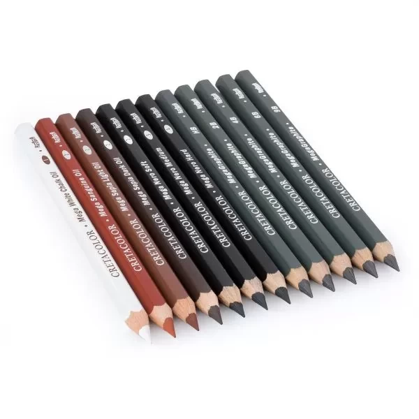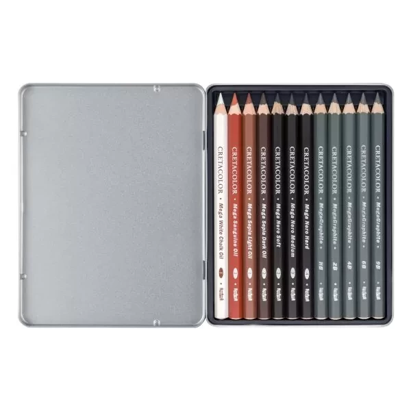 Content: 7 pcs. Artist Pencils (White chalk oil, Sanguine oil, Sepia light oil, Sepia dark oil, Nero soft, medium, hard), 5 pcs. Graphite Pencils (HB, 2B, 4B, 6B, 9B)