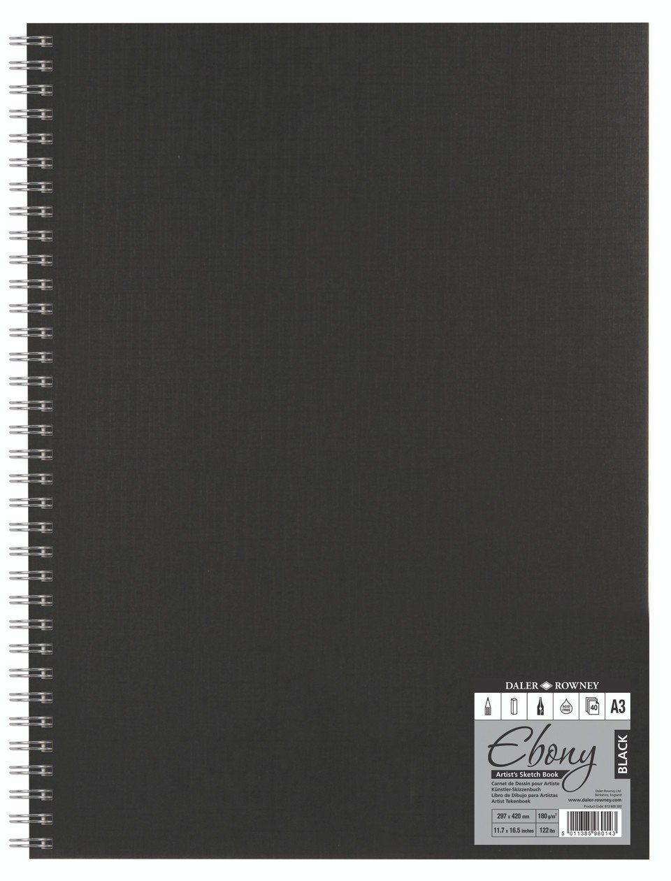The Daler-Rowney Ebony Portrait Black Spiral Sketchbooks feature a selection of artists' black cover spiral sketchbooks with premium quality, crisp, black cartridge paper suitable for all dry techniques and pen & ink work.
