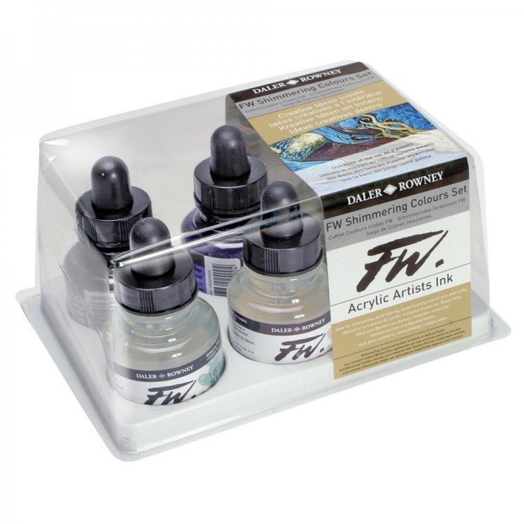 Daler Rowney Shimmering Pearlescent Liquid Acrylic Artist s Inks are lightfast, waterproof, watercolour inks in shimmering, iridescent colors. They are ready to use straight from the bottle with dip pens and brushes. Colours can be intermixed. Each glass bottle contains 1 oz (30 ml).