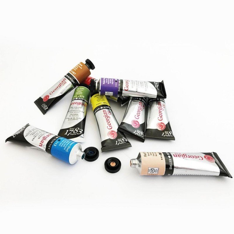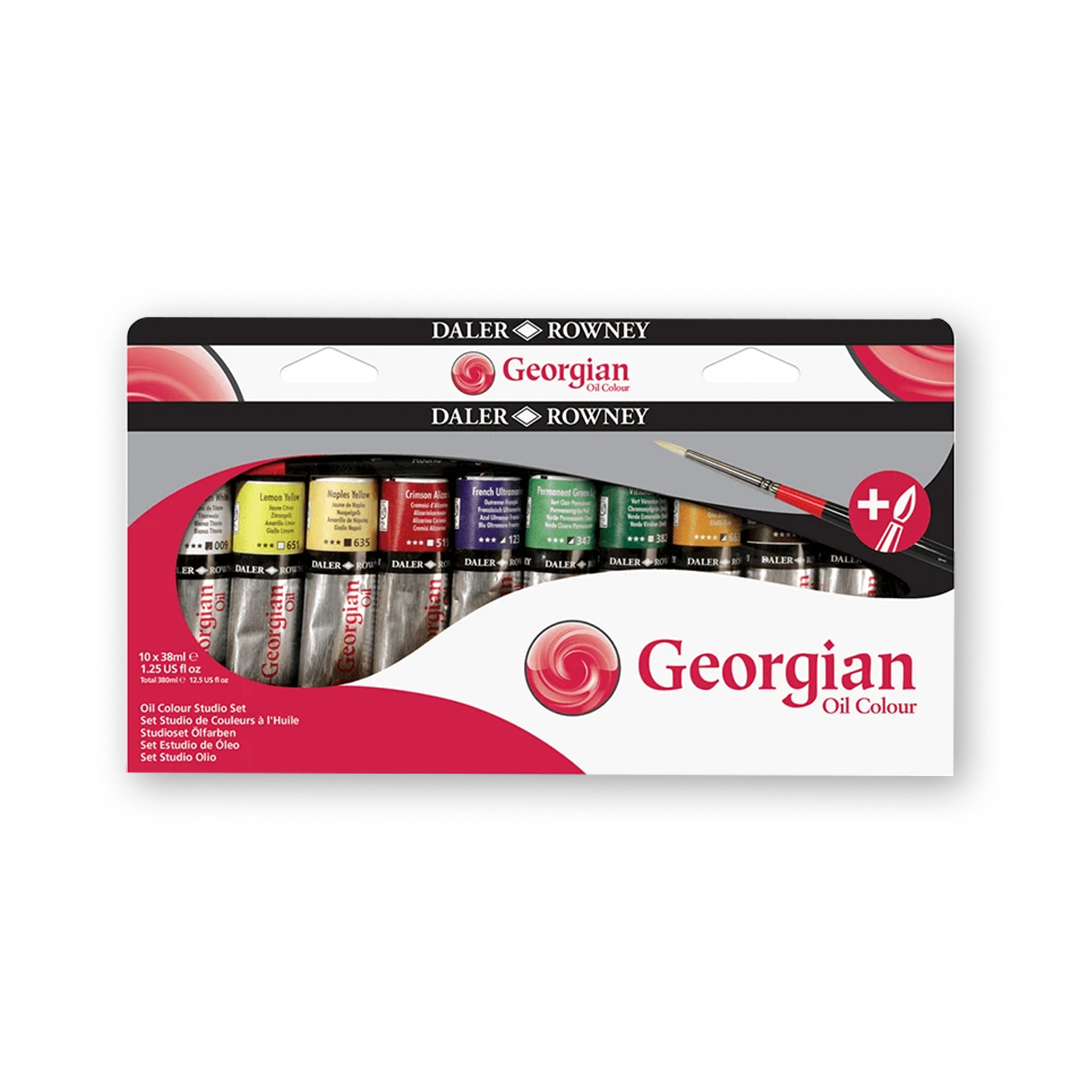 The Daler-Rowney Georgian Oil Colour Studio Set contains ten 38ml colours and a FREE Georgian Oil Round Brush No. 1.