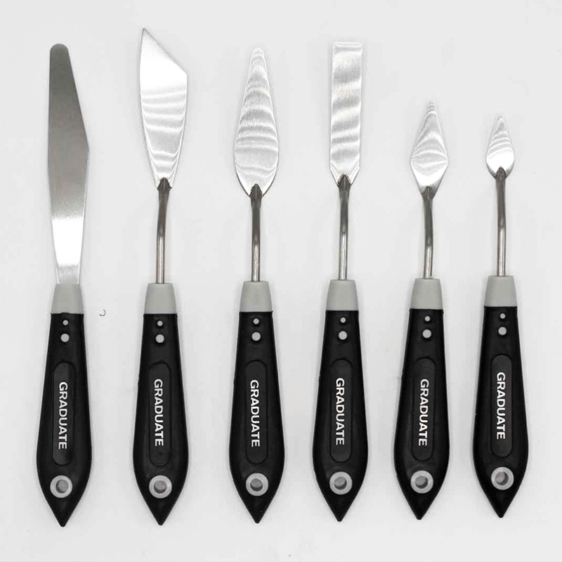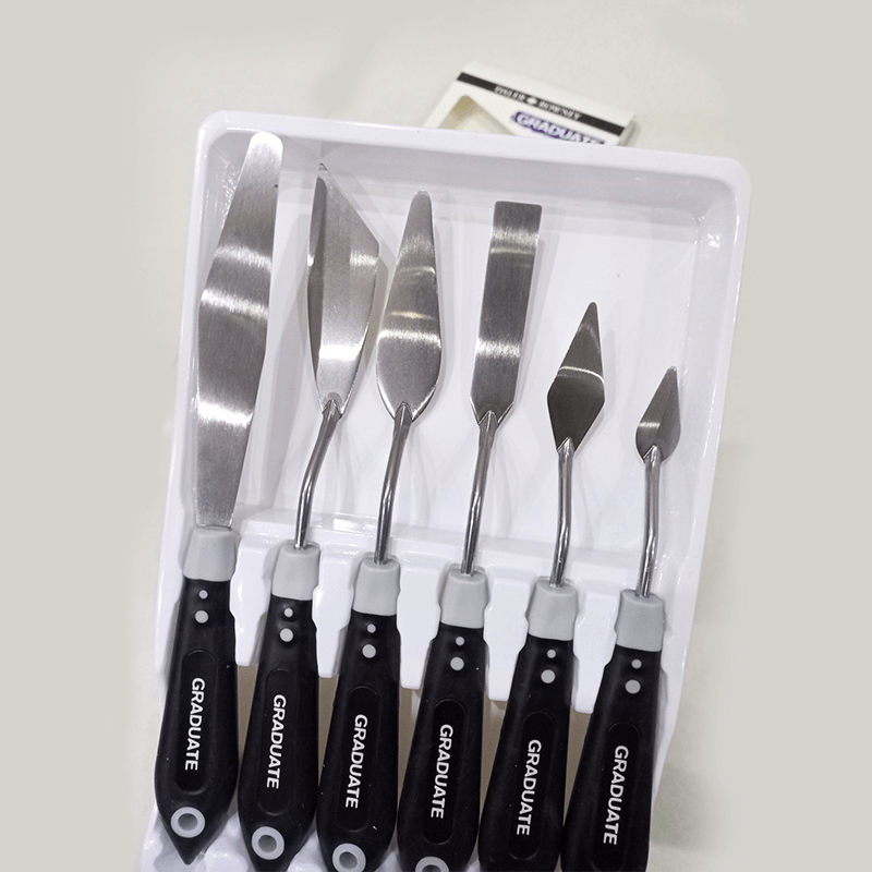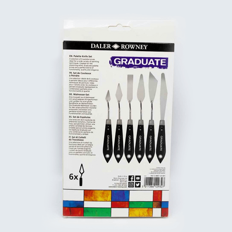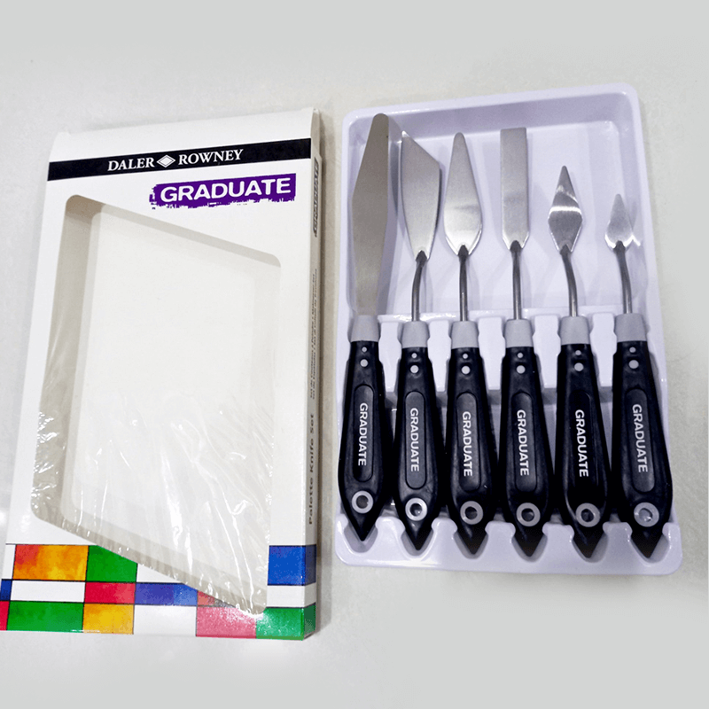 This fantastic Graduate palette knife set of 6 from Daler Rowney is ideal for beginners and professionals alike. It comes with 6 different shaped heads including a large shaped knife. These palette knives come equipped with soft grip handles to make for a better hold in your hand.