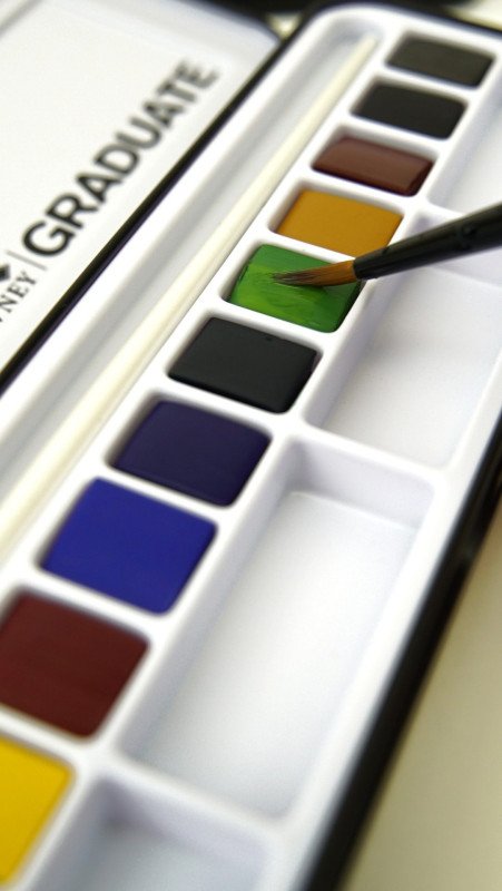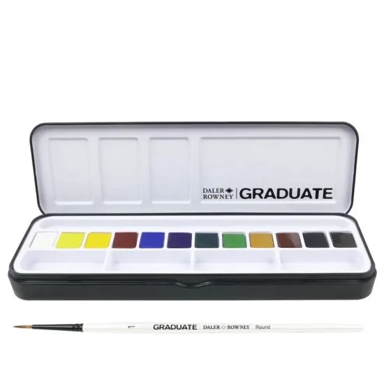 This Set of 12 Daler Rowney Graduate Watercolor Half Pans are a perfect starting point for artists of all levels especially students looking to experiment with watercolor techniques. The colors wet easily onto the surface, and can be thinned with water to create washes and balance quality and great value perfectly. These paints have vivid pigments and are fast drying, though can be reworked by adding a little water. Additionally this set comes with a brush and palette inside that is perfect for travelling with as it will easily fit in your bag.