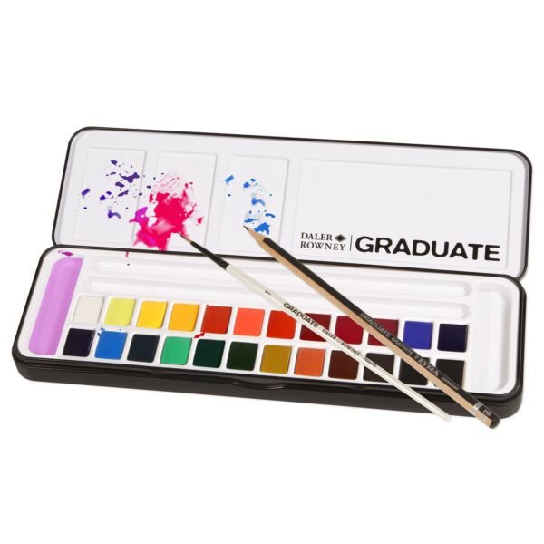The Graduate Watercolour in a durable metal tin contains 24 popular half pan colours, carefully chosen to cover all essential needs of artists. The set also includes a size 1 Graduate synthetic round brush and a Lyra Graduate graphite pencil, making it an excellent starter kit.