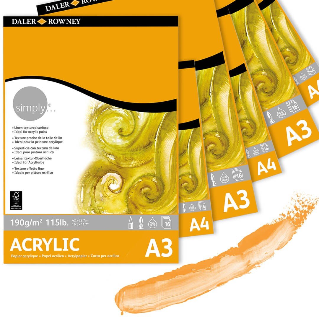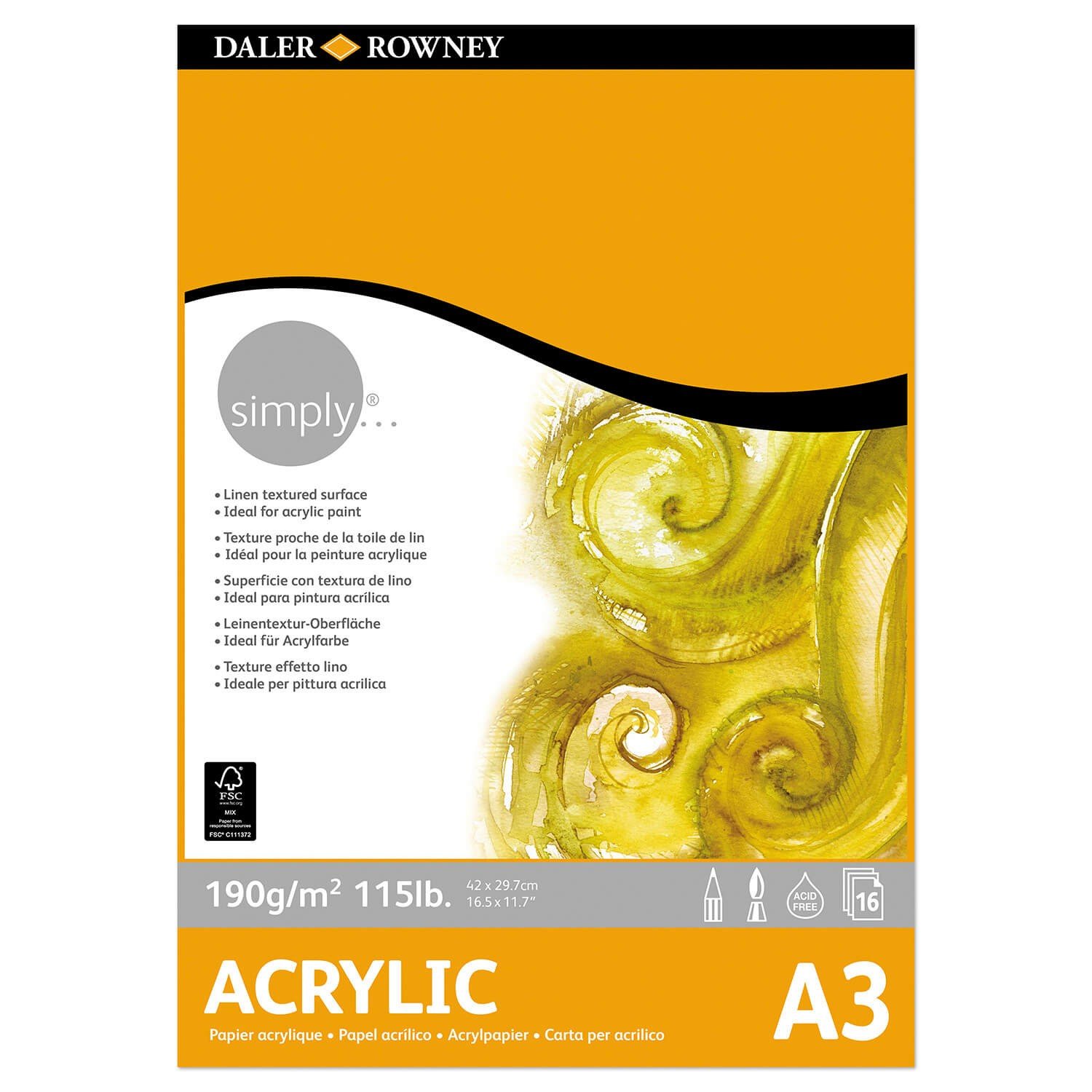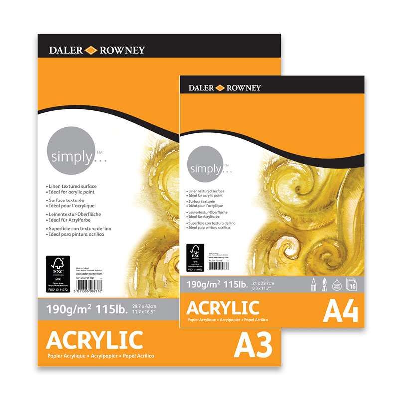 Daler-Rowney Simply Acrylic Paper is a good quality surface with a canvas-like texture. The canvas-like acrylic paper is perfect for painting with specifically acrylic colors, and the weight of the paper prevents the paint from soaking through to the next page. The range of Simply gummed pads has been chosen to meet the needs of artists at entry-level. They are available in A3 and A4 pads of 16 sheets.