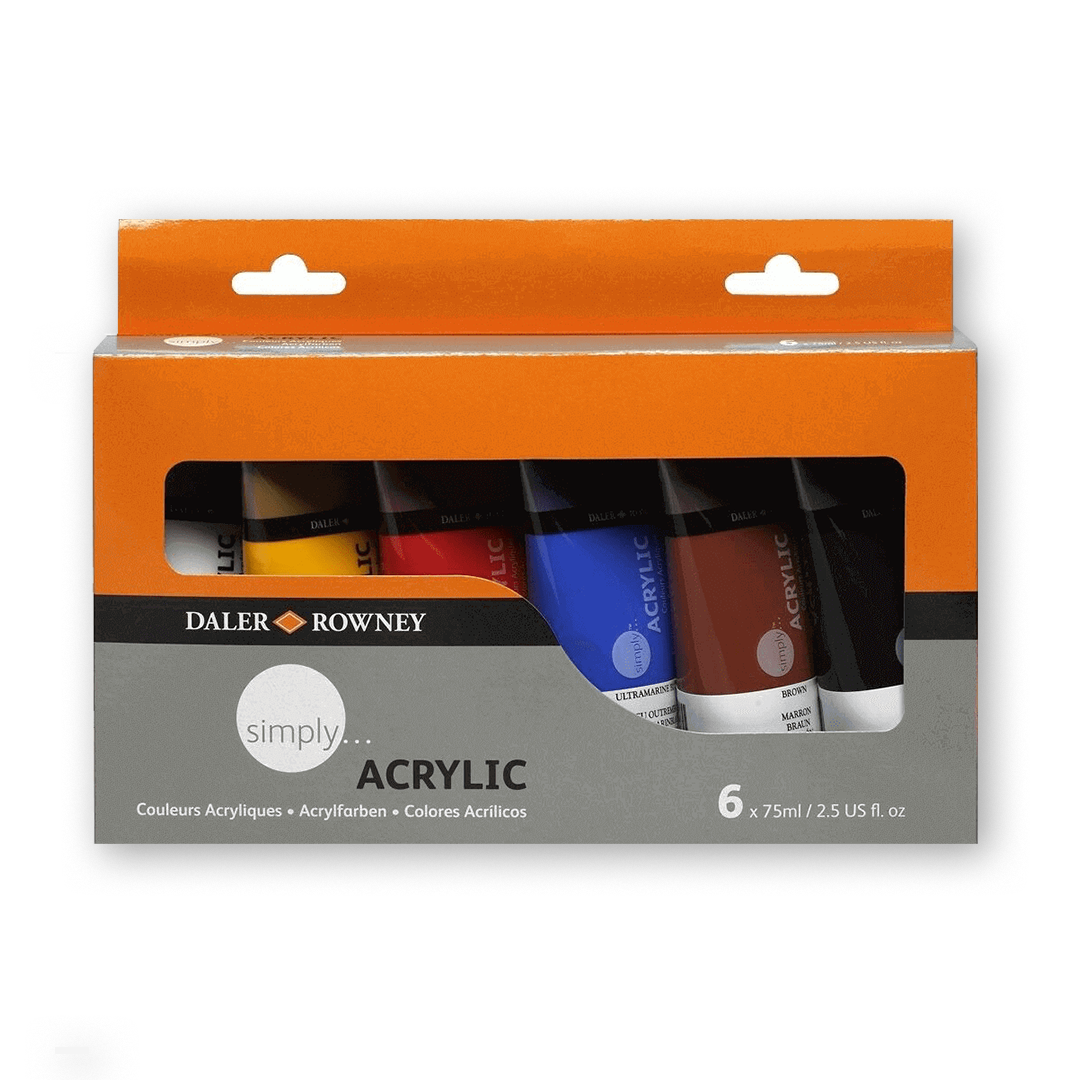 Student entry level starter set of 6 x 75ml acrylic paint tubes. Consisting of White, Lemon Yellow, Leaf Green, Light Blue, Violet and Black. Smooth vibrant colour paint. Suitable for a wide range of surfaces.