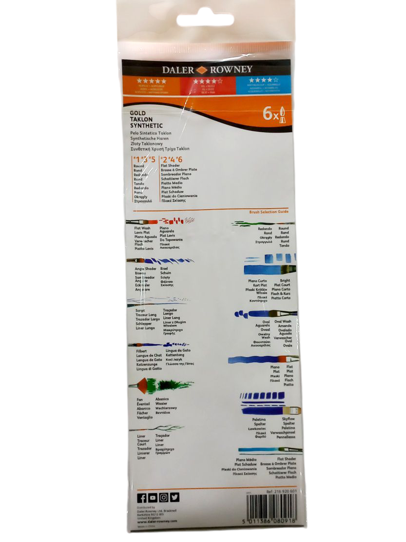This all-rounder set of six includes three round brushes sizes 1, 3 and 5, and three flat brushes sizes 6, 4 and 2, and represents great value. Imported from England.