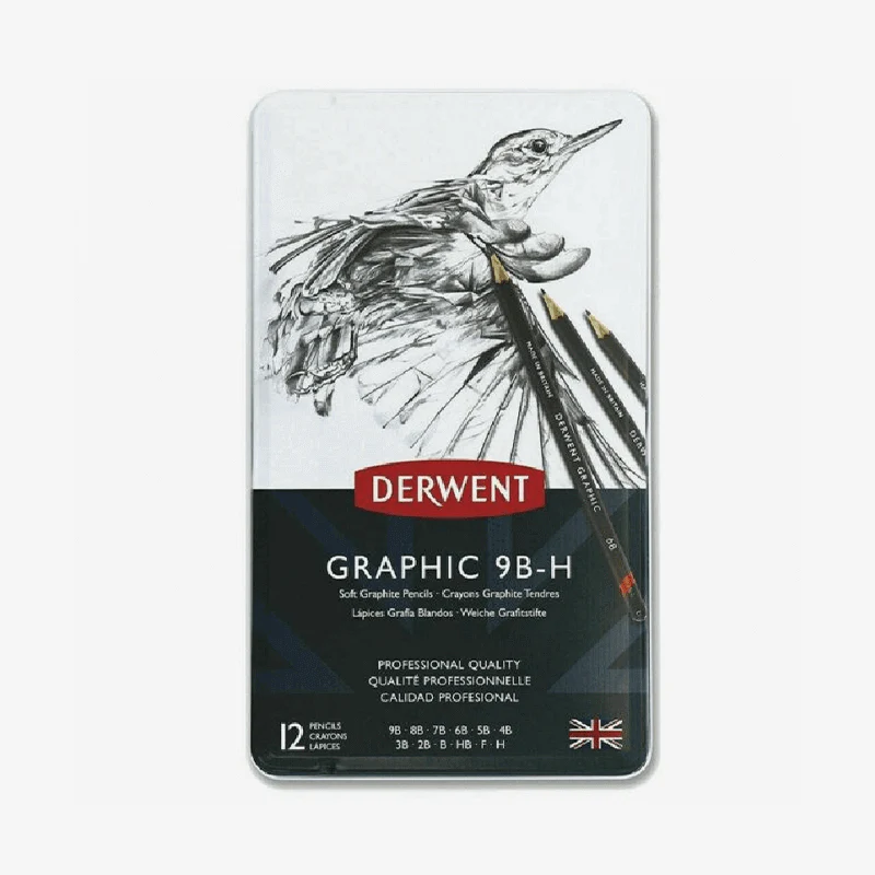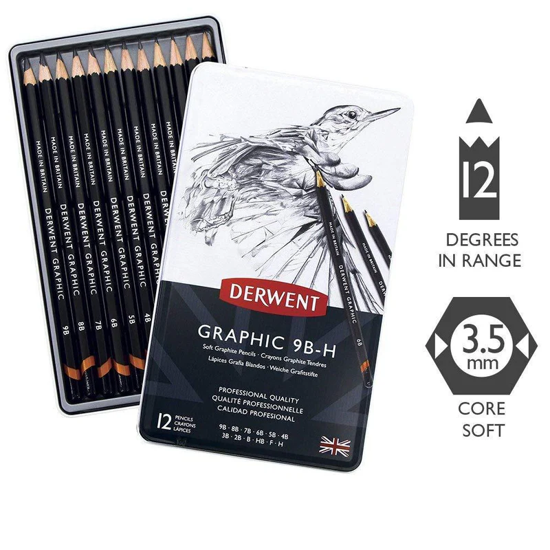 Ideal for expressive sketches and portraiture or detailed illustrations, as you can blend, layer and build seamlessly with a variety of depths of greys and black tones. Derwent Graphic has one of the largest choices of graphite shades available in the market with 20 consistent degrees from 9B to 9H.