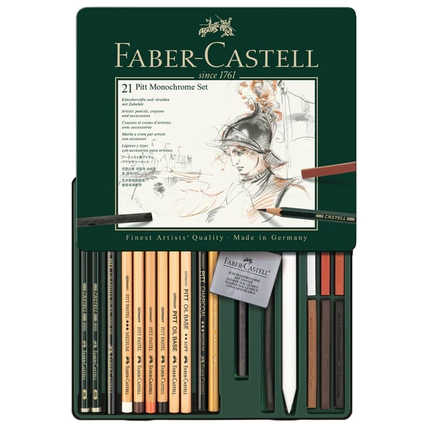 The Pitt® Monochrome Sets are designed for the "mobile artist". This 21 piece set is handy and portable for sketches and studies using charcoal, graphite, artist's pencils, and crayons.