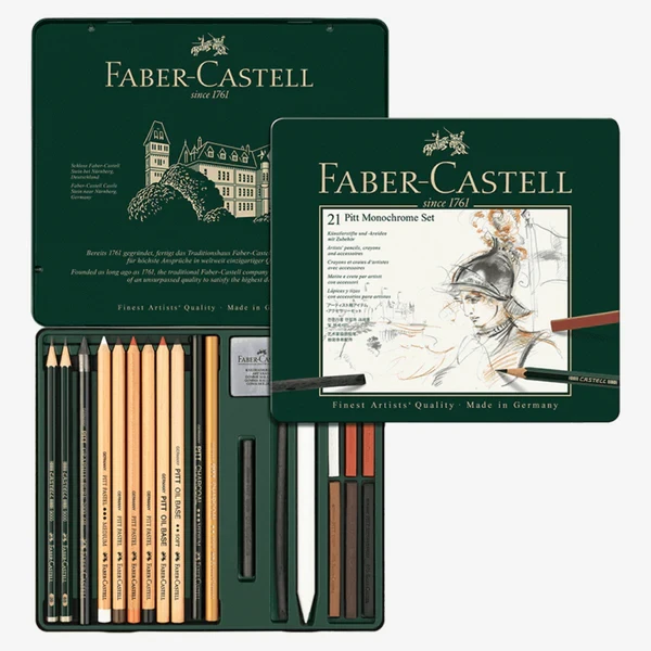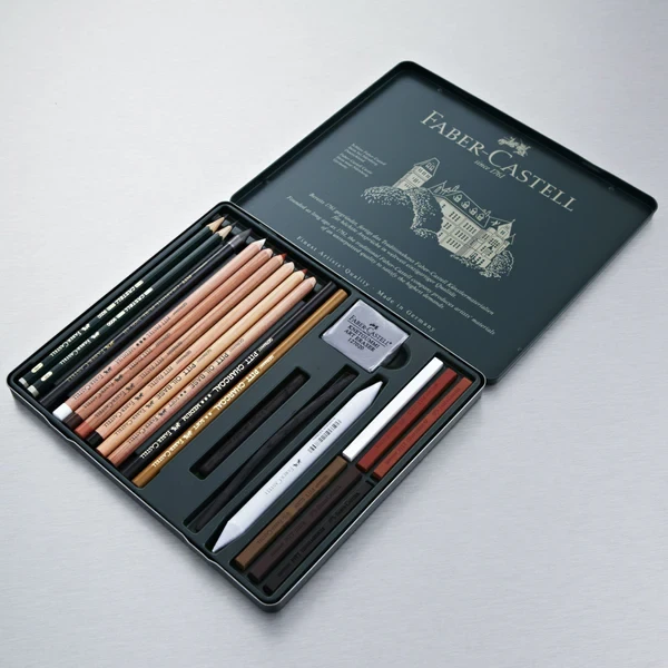 Contents Include: 2 Castell® 9000 Pencils: 2B and 6B. 1 Pitt® Graphite Pure Pencil: 6B, 2 Pitt® Oil Base Pencils, 4 Oil-free Pitt® Pastel Pencils, 6 Oil-free Pitt® Pastels, 1 pressed Pitt® Charcoal Stick, 1 natural Pitt® Charcoal Stick, 1 natural Pitt® Charcoal Pencil, 1 pressed Pitt® Charcoal Pencil, 1 Kneadable Art Eraser and 1 Paper Wiper in a metal tin