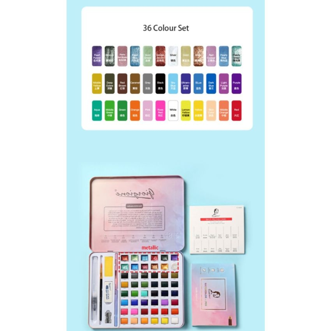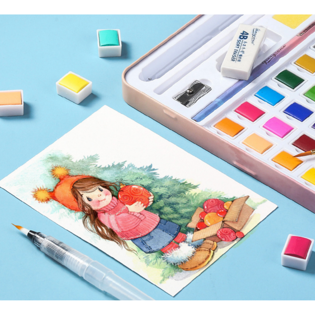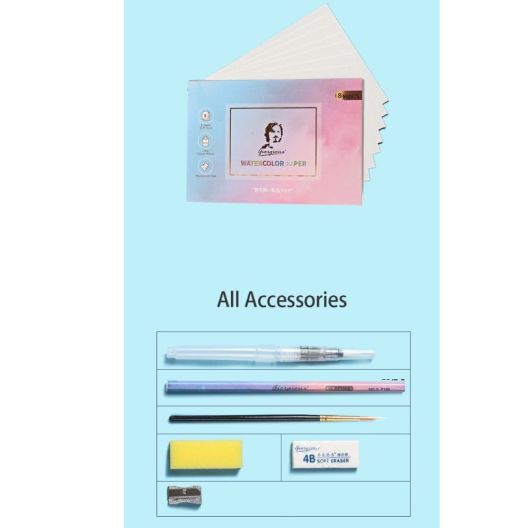 Each set comes with a swatch card, watercolor paper, water brush, sponge, sketch pencil and eraser.