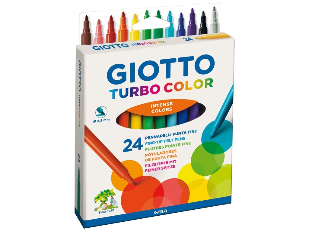When you need to colour, Giotto Turbo Color pens never let you down! Created using harmless, washable inks, they come with a fine fibre tip that is super tough and durable and will never retract. Available in 36 intense, bight colours. Giotto Turbo Color pens are 100% safe thanks to their ventilated safety caps. Made In Italy.