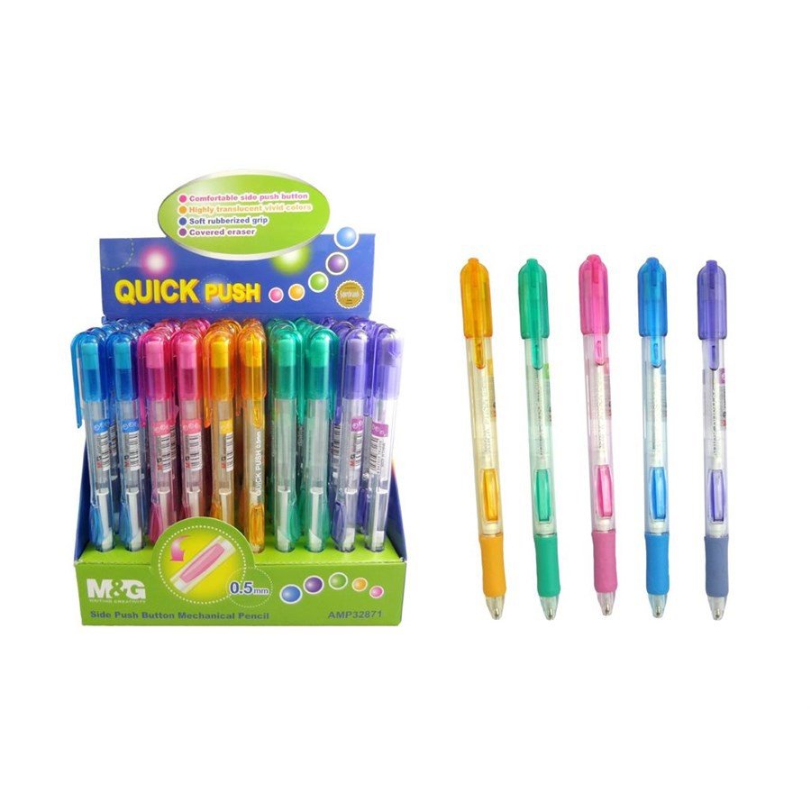 Tip Size: 0.5 mmComfortable side push button mechanical pencilHighly translucent vivid coloursSoft rubberized gripCovered eraser