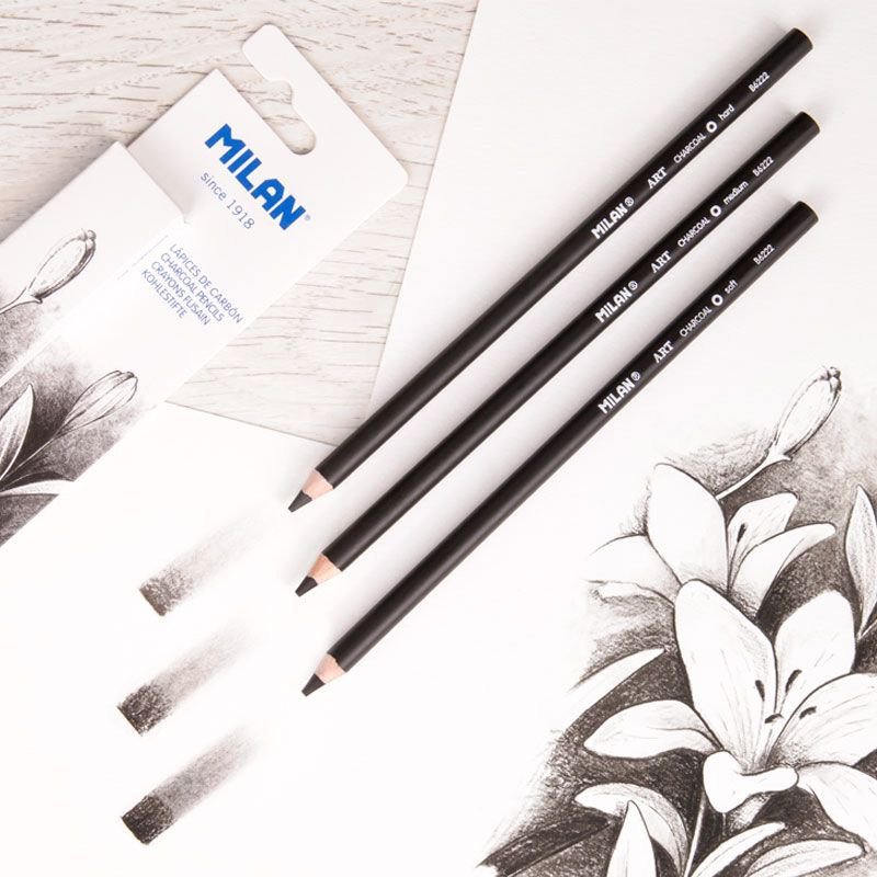 MILAN Art charcoal pencils set for drawing. Round with Ø 4 mm thick lead. Includes 3 units with different hardness (soft, medium and hard) for different intensity strokes.