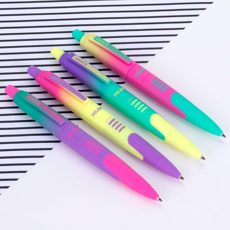 Sunset series COMPACT pen, blue ink. Approximate writing length of 1000 metres. 1 mm tip. Ink manufactured in Germany. Double-click button. Original design, created by MILAN’s own R+D department. 4 assorted colours: yellow, violet, pink and green. Measurements of pen: 14.1 x 1.7 cm. 1.4 cm Ø