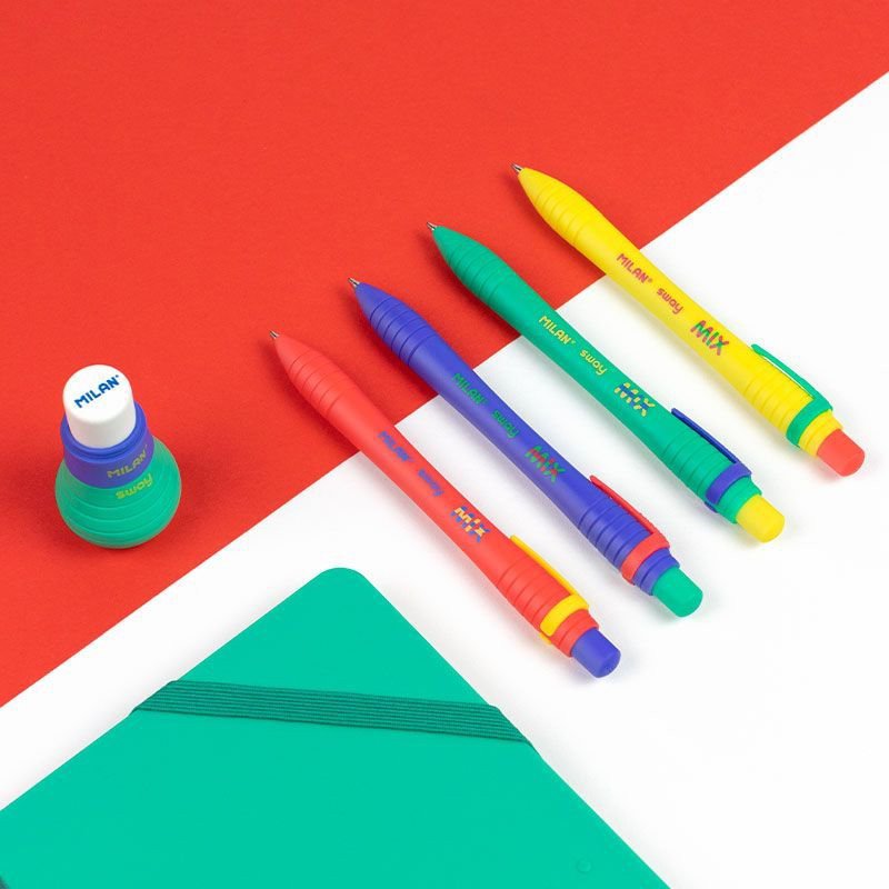 SWAY Mix pen with blue ink. Approximate writing length: 1,000 meters. 1mm tip. Original design created by the MILAN R&D Department. Pen size: 12.8 x 1.4 cm. 1.2 cm Ø. 3 units of various colors: blue, yellow, green and red.