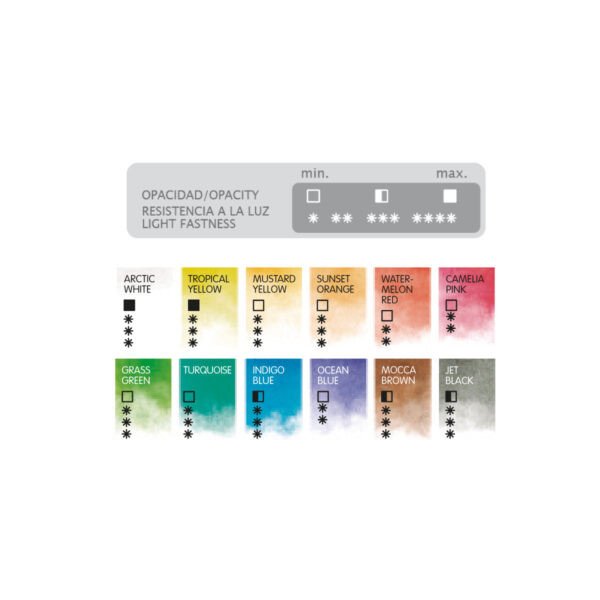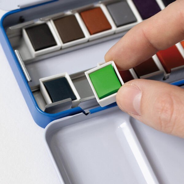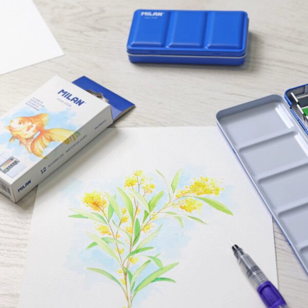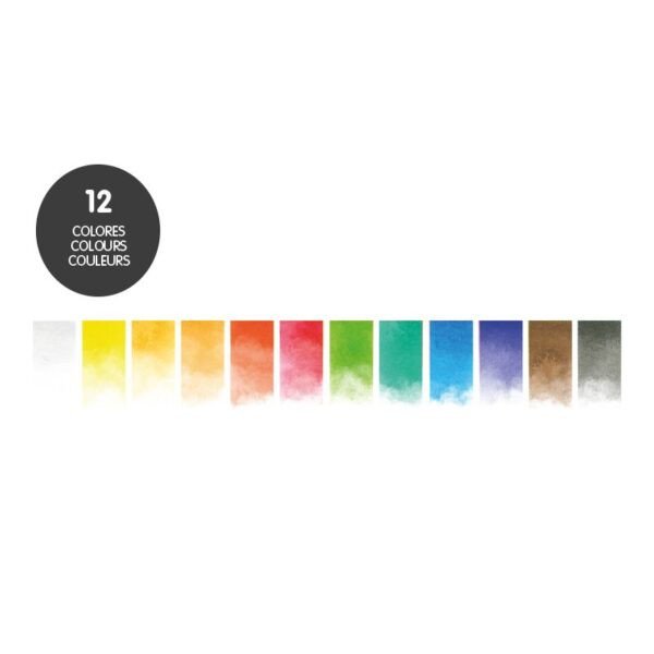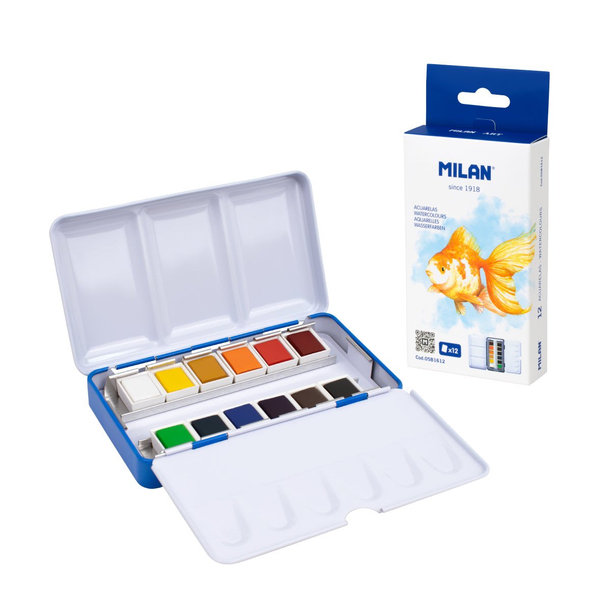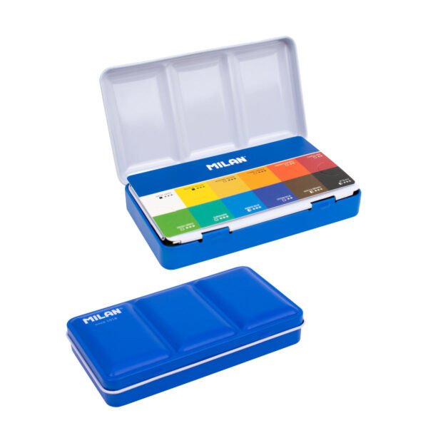 Metal case with 12 MILAN Art watercolour half pans, with folding tray and rear ring. The colours are obtained from innocuous pigments, and are opaque and resistant to light. Colours easily mix. Specially indicated for artists. It can be easily washed off from most fabrics if done immediately after staining. Cardboard box with hanger. Made in Spain.