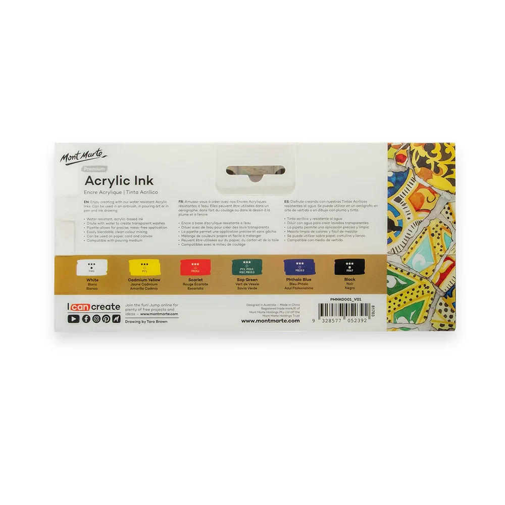 Create fine detail, washes of colour and so much more with our Acrylic Ink 6pc. Inside the set are six acrylic-based inks in essential colours that blend easily and mix cleanly. Thanks to their ultra fluid consistency, these versatile art inks can also be used in an airbrush, pouring art and pen and ink drawing. Plus, they’re water-resistant once dry, so you can layer other painting and drawing mediums on top. Each bottle comes with a pipette so you can precisely drop in colour, mess free! Best used on porous surfaces including, paper, card and canvas. Pick up an acrylic ink set and enjoy creating!