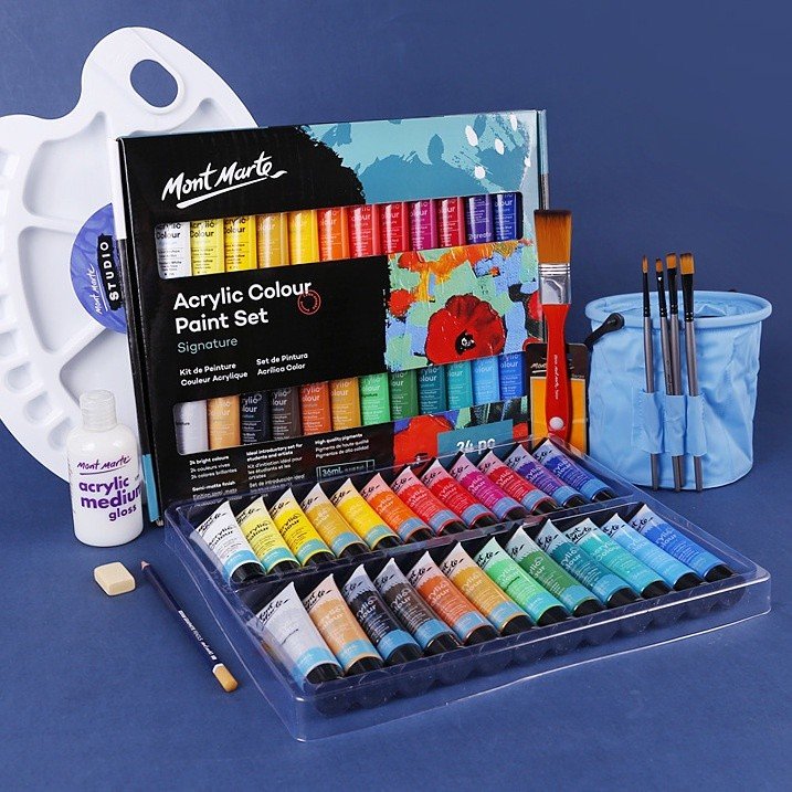 Dive into the world of painting with our Signature Acrylic Paint Set. This set comes with 24 great colours that dry quickly to a semi-matte finish. Whether you're a student or an artist, create something new today.