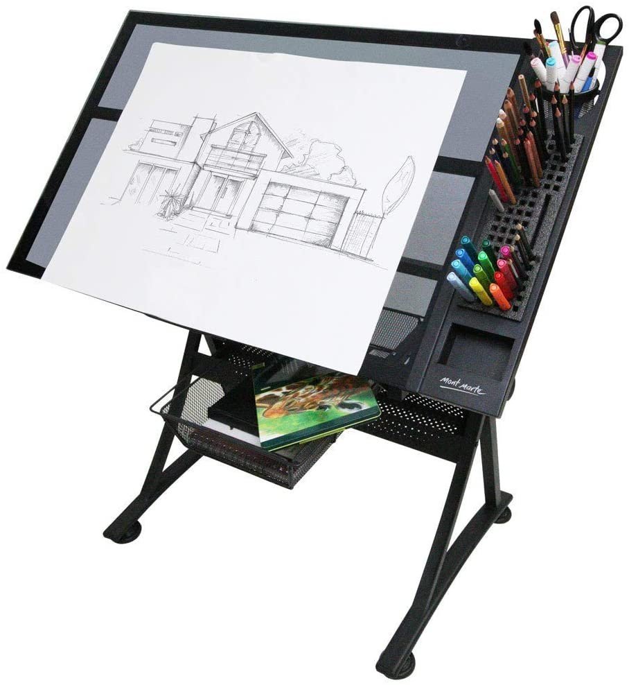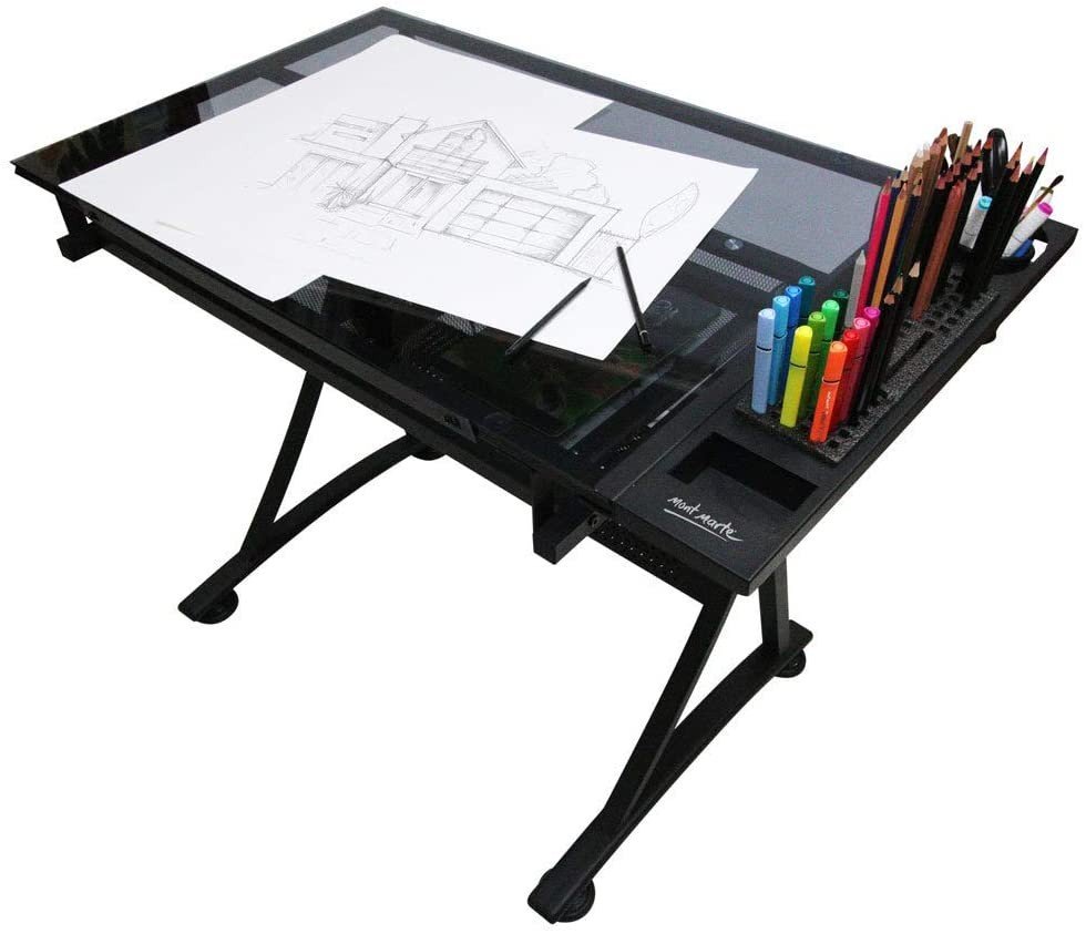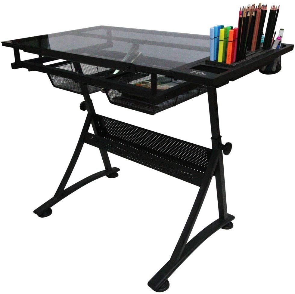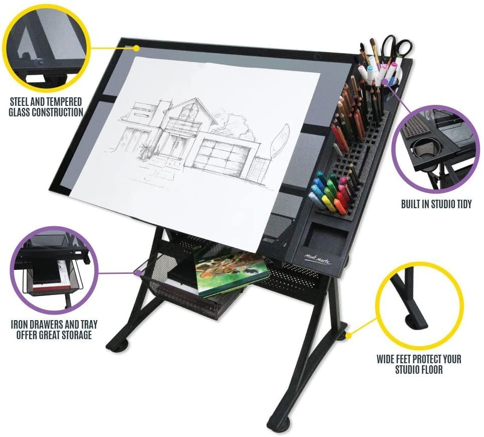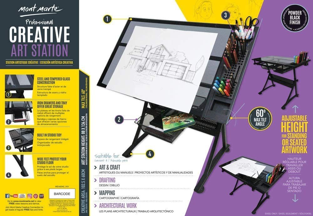 Revolutionise your creative workspace with our professional-grade art station. Featuring an art desk, plenty of places for your materials and an ergonomic design, it gives you a sturdy and practical space to work. This versatile art station is suitable for a range of creative disciplines; from art and craft projects, to drafting and large-scale jobs such as mapping and architectural work. Adapt it to a standing or sitting position using the ergonomic height adjustable design. Featuring a sturdy base, tempered glass easel with a tilt range of 60 degrees, steel frame and steel drawers for storage space, this multi-use art station is practical and built to last.
