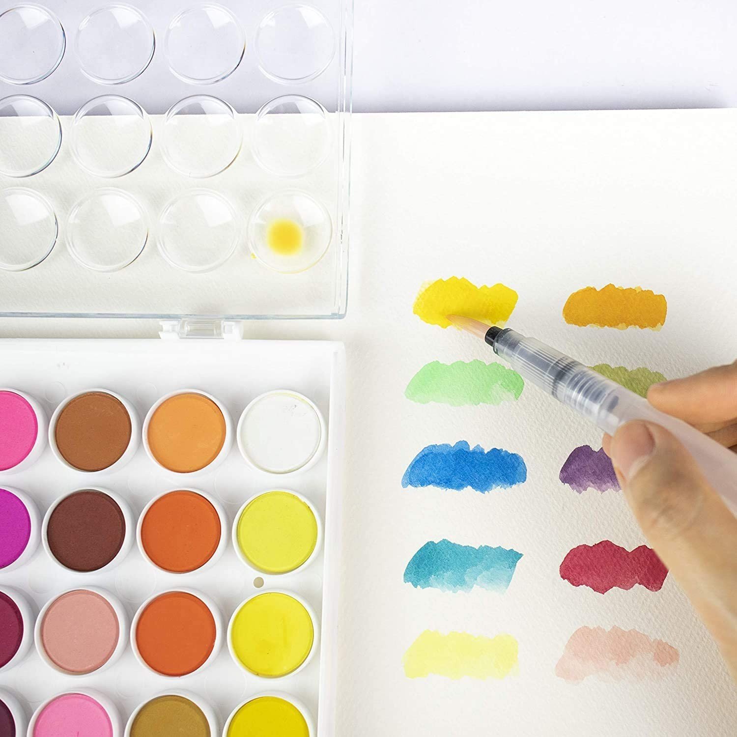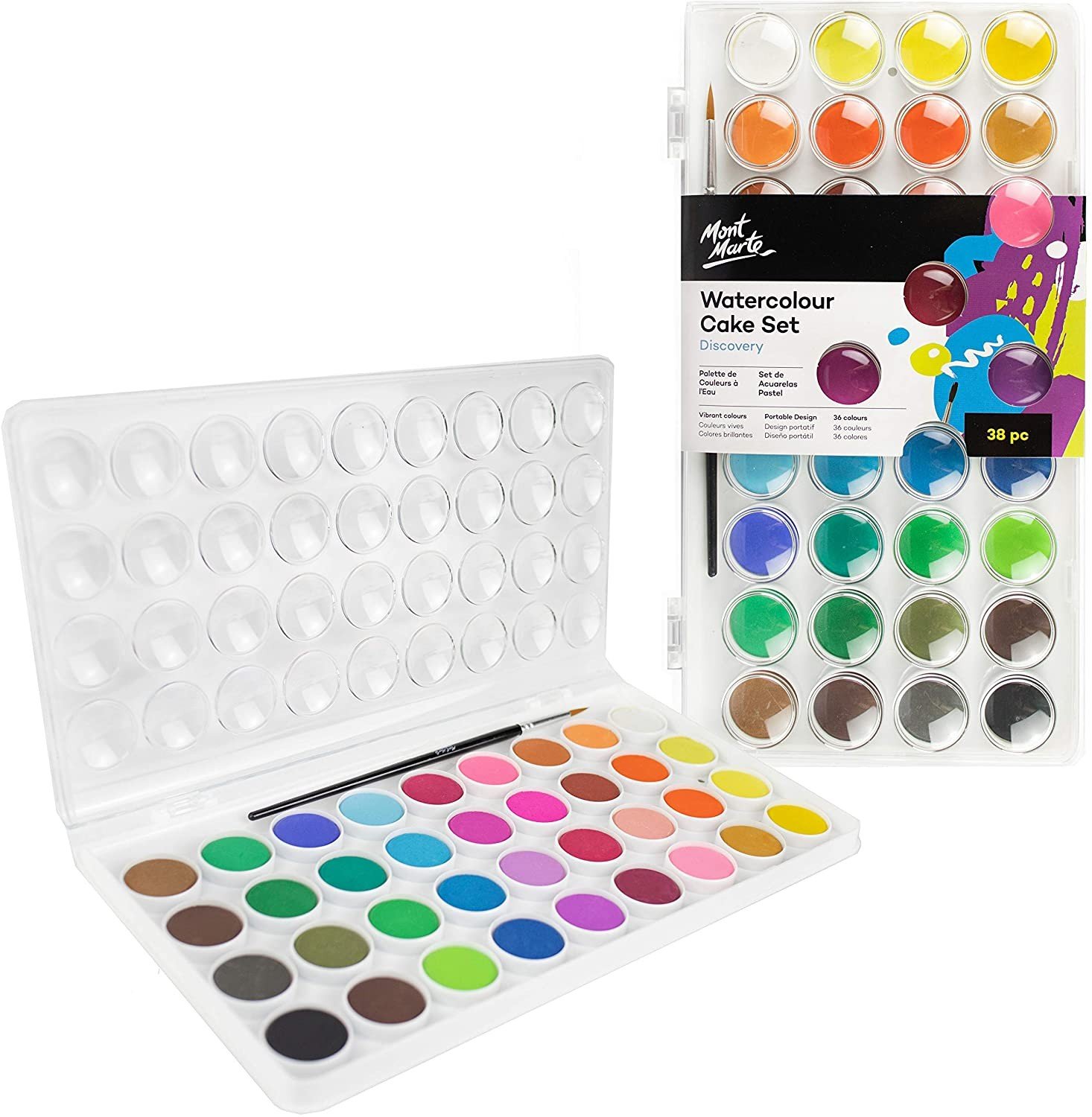 Hone your artistic skills with our watercolour cake set. Featuring a nylon brush and 36 vibrant shades spanning the colour wheel, this watercolour paint set is an essential addition to your art materials. Whether you're a seasoned artist or student, you'll get great use out of this practical set. Each watercolour cake has it's own corresponding mixing well in the lid so you can mix and experiment with your colours. Explore your potential and keep your workspace tidy with this compact watercolour paint set.