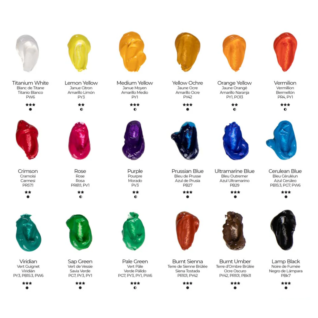 • 18 colours: Titanium White, Lemon Yellow, Yellow Mid, Vermilion, Orange Yellow, Yellow Ochre, Crimson, Rose, Pale Green, Cerulean Blue, Viridian, Sap Green, Prussian Blue, Ultramarine Blue, Purple, Lamp Black, Burnt Umber, Burnt Sienna