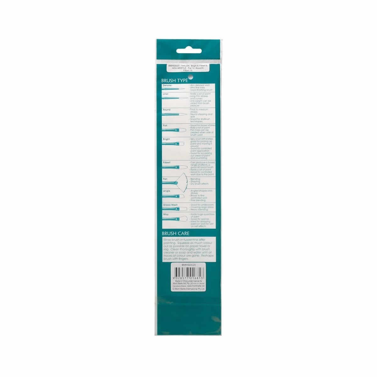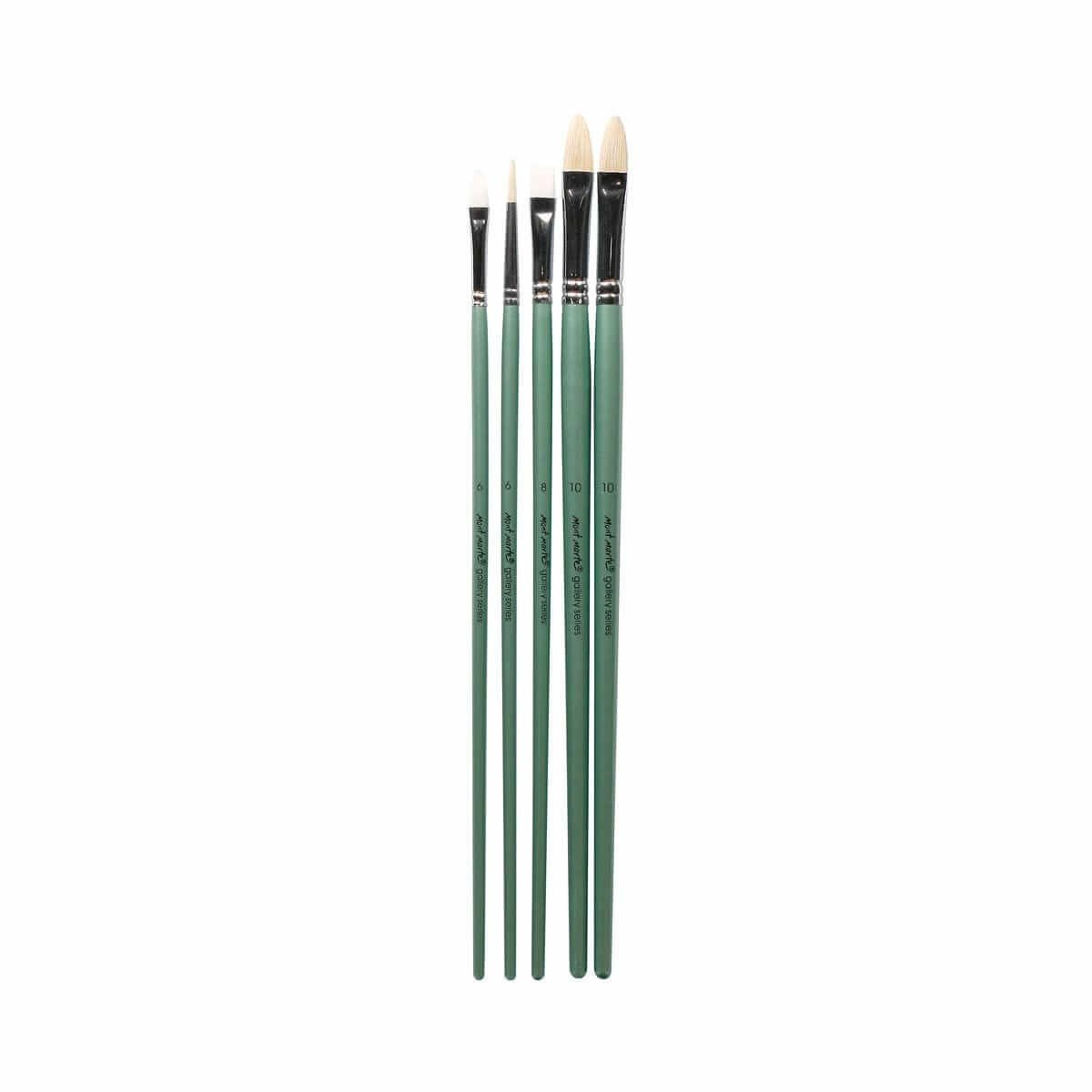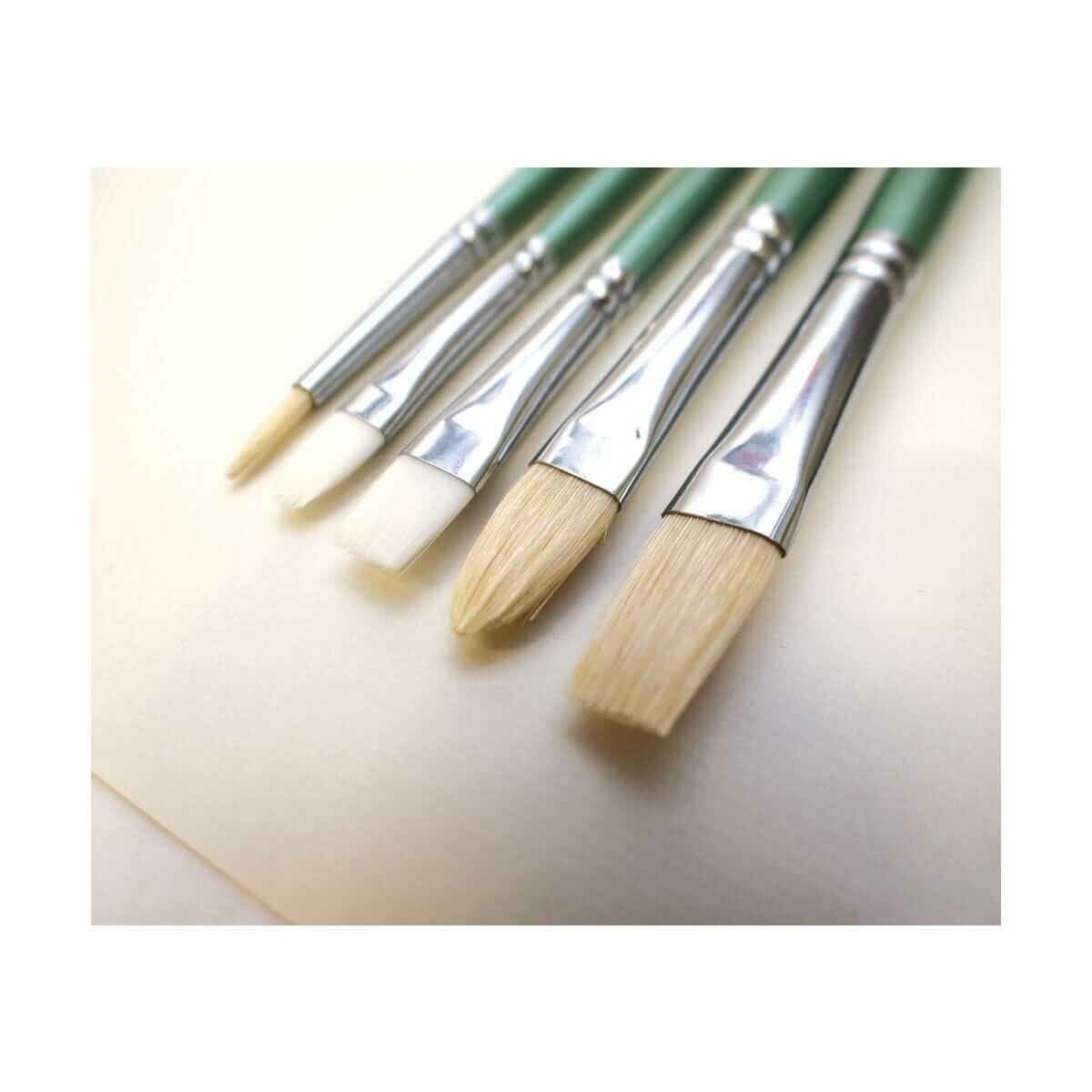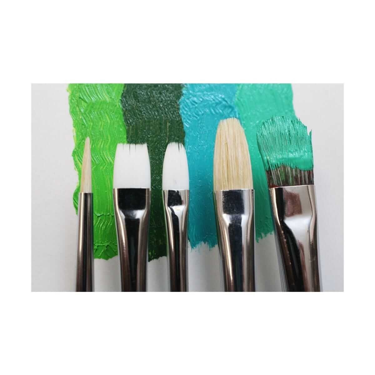 5 brushes included (1 x Taklon Bright 8,1 Taklon Filbert 6,1 x Hog BristleFlat 12,1 x Hog Bristle Round 6 and1 x Hog Bristle Filbert 10).