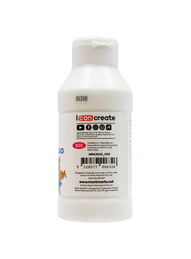 Mont Marte Premium Clear Texture Gesso is suitable for preparing your artwork surfaces with a transparent finish. You can use this versatile medium with acrylic, oil, pastels, and other paint media. It is lightweight, non-yellowing, and dries to a water resistant finish. This clear gesso is intermixable with Mont Marte acrylic paints and mediums, allowing you to create a tinted gesso by mixing it with a colour of your choice.