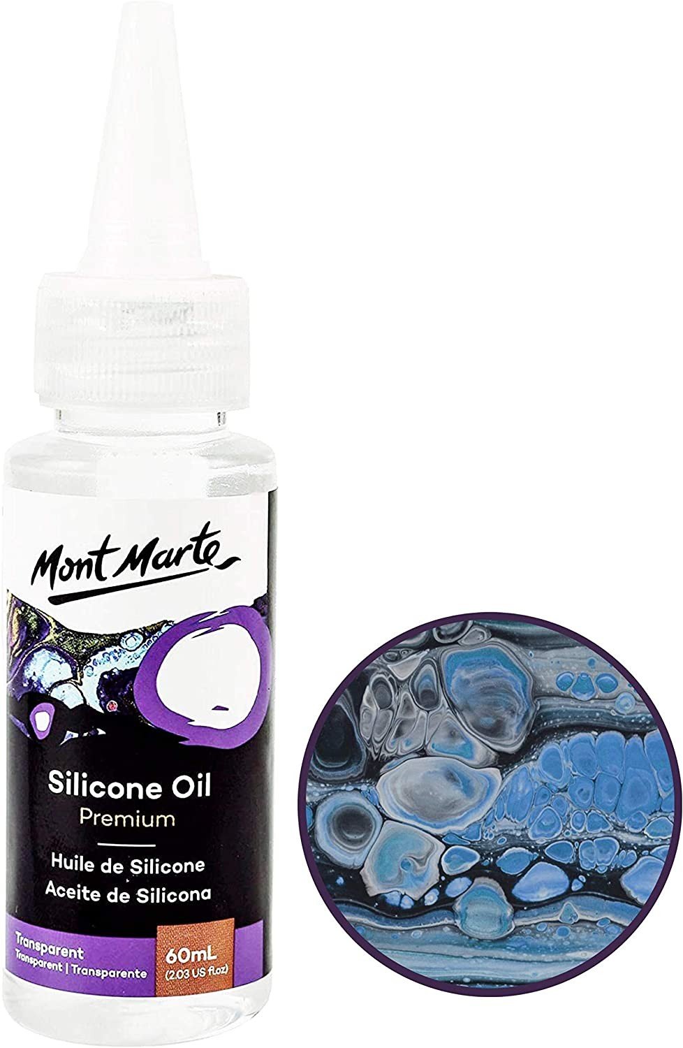 he Mont Marte silicone oil has been specially developed for use with acrylic paints and pouring medium. It helps you to achieve a beautiful cell formation during the pouring painting technique and is perfectly matched to the Mont Marte acrylic paints.