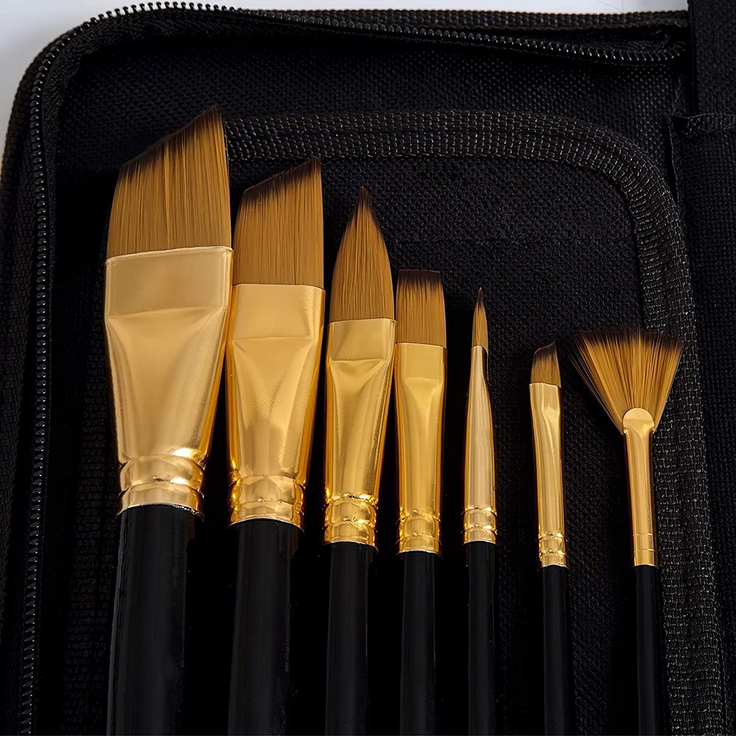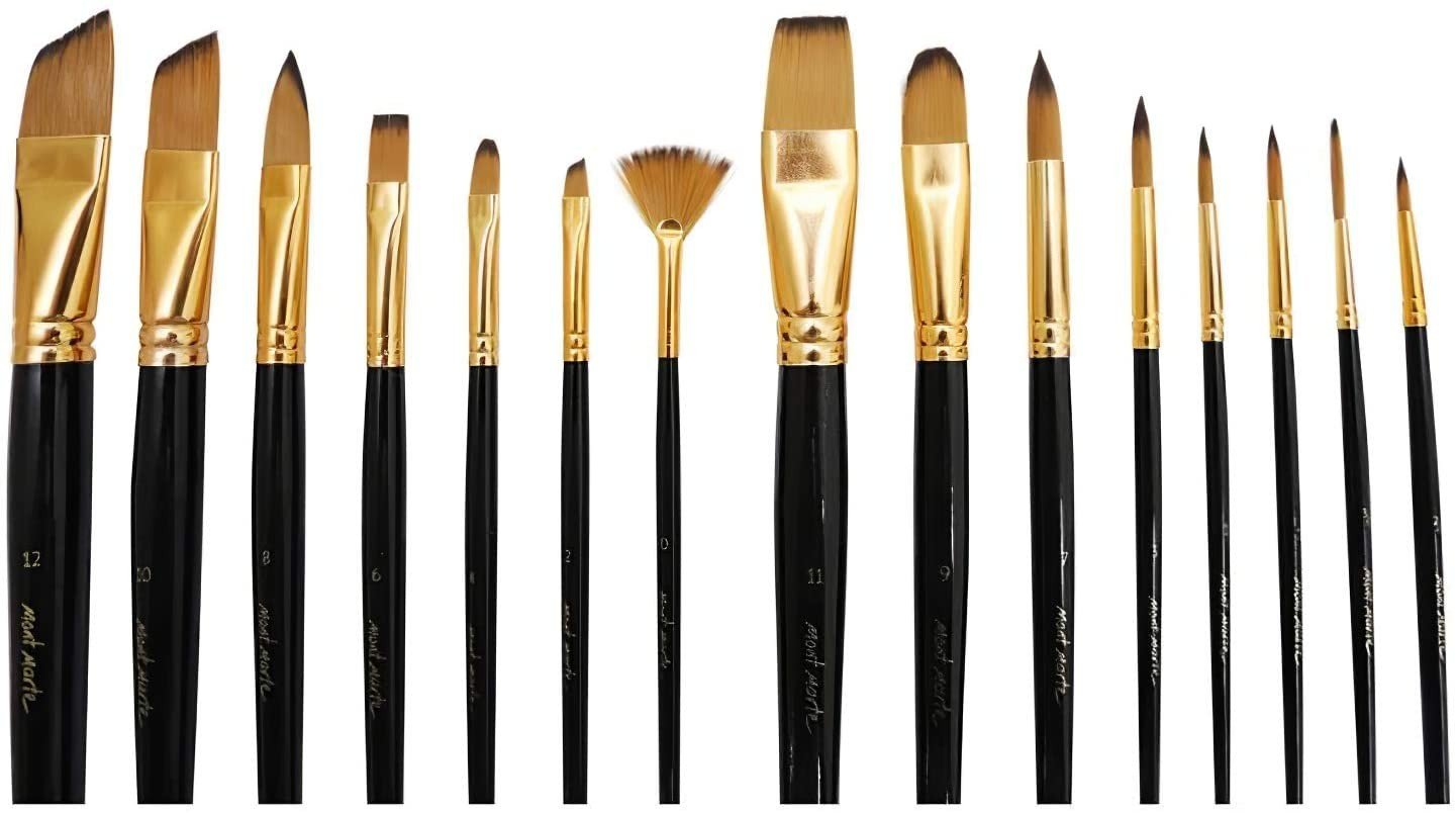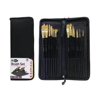 This 15 piece taklon paintbrush set is a great introduction to professional quality brushes. The zippered easel display case makes travel easy and folds out into a paintbrush desk tidy for quick access while you paint. It’s perfect for keeping your brushes organised and in tip-top condition. Each brush in this amazing set features a two-tone taklon bristle that is best suited for use with acrylics, watercolors and gouache. These extremely versatile brushe