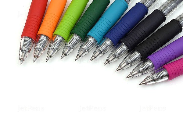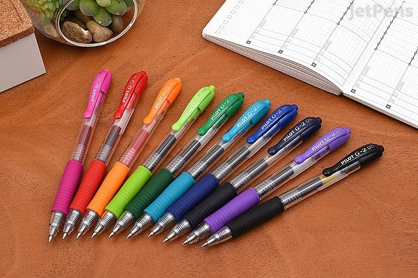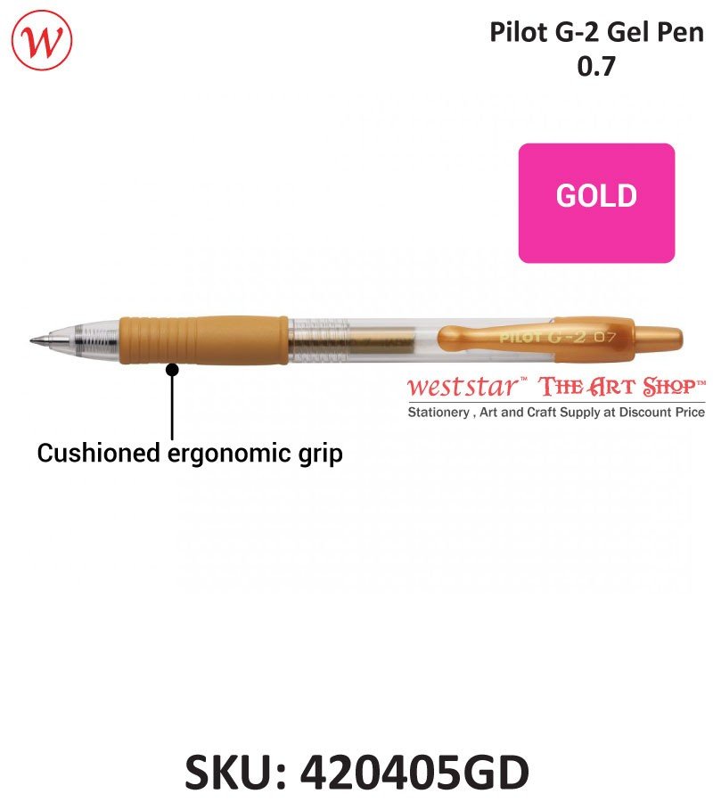 Retractable Pilot G-2 with a dynamic Gel Ink Formula that's smooth writing and smear-proof. The rubber grip i contoured for better writing comfort. 0.7 mm ball. Line width: 0.39 mm.