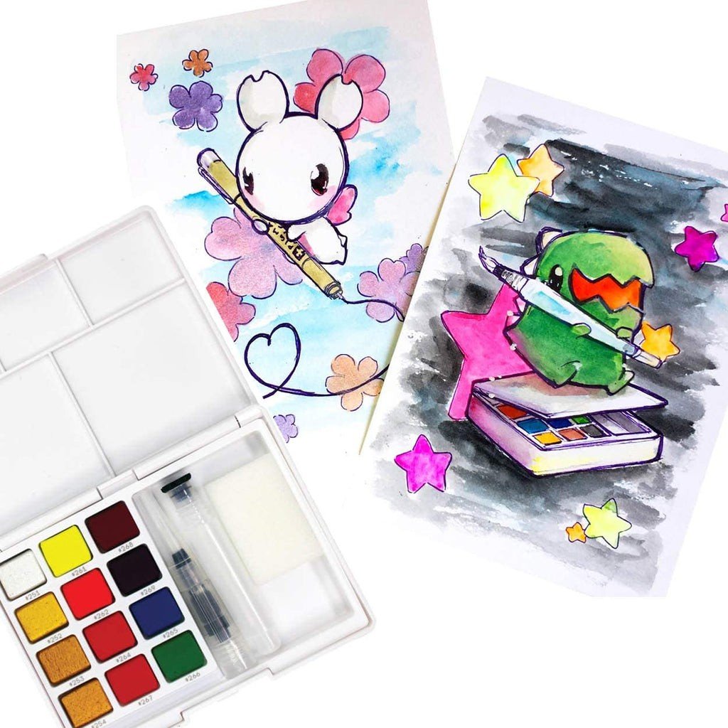• 12 half pan watercolors consisting of 8 fluorescent & 4 metallic colors