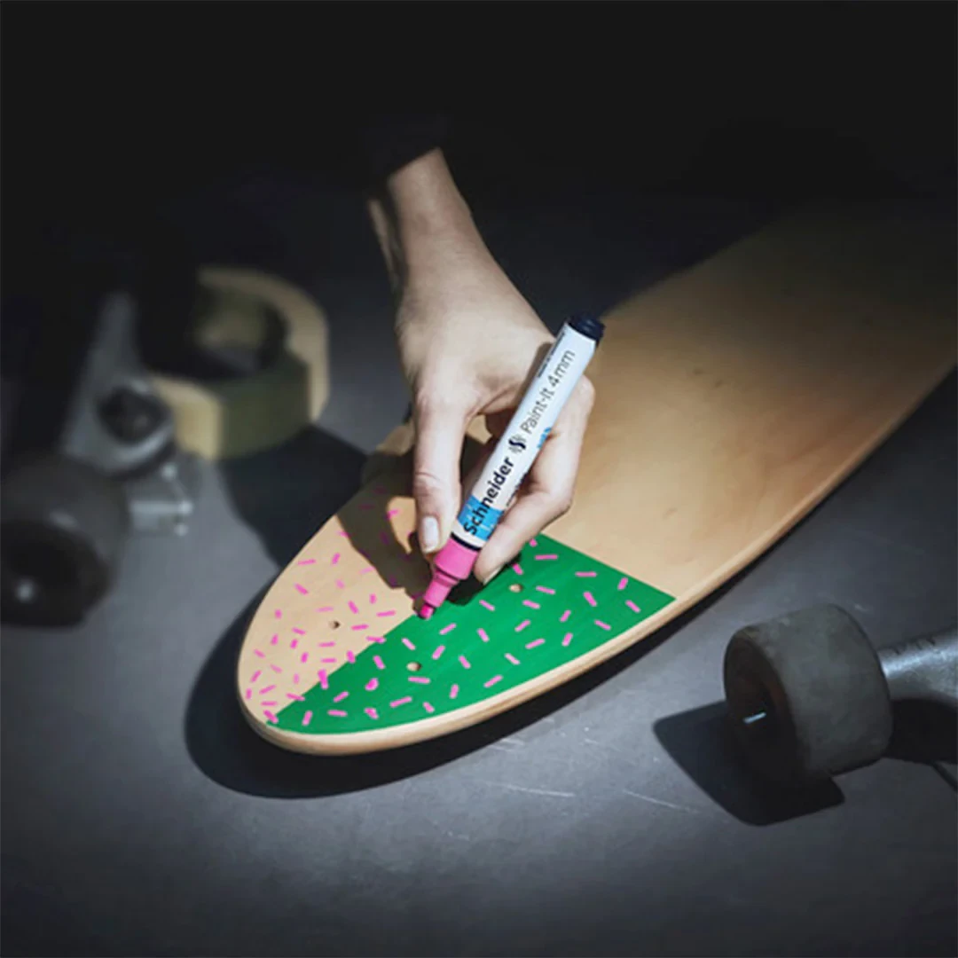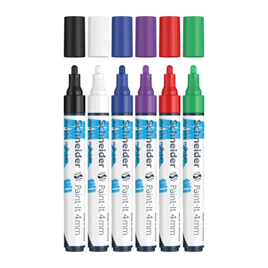 Acrylic marker 4 mm for creative work. Wallet with 6 pieces: black, white, blue, violet, red, green. The right tool for any of your projects. High coverage, quick-drying and high colour brilliance. The optimised ink is suitable for almost any substrate: wood, metal, paper, cardboard, stone, etc. The water-based and odourless ink is perfectly controlled by a valve, to suit your needs.