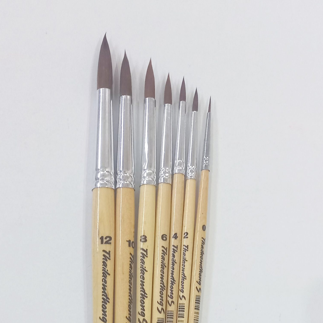 Thailaemthong brush made of the finest quality synthetic hair. These brushes have an excellent color-holding capacity and durability. Handles are sealed and set in seamless aluminium plated ferrules. The brushes is perfect use with watercolor, acrylic and poster color. They are available in 7 sizes from 0 – 12.