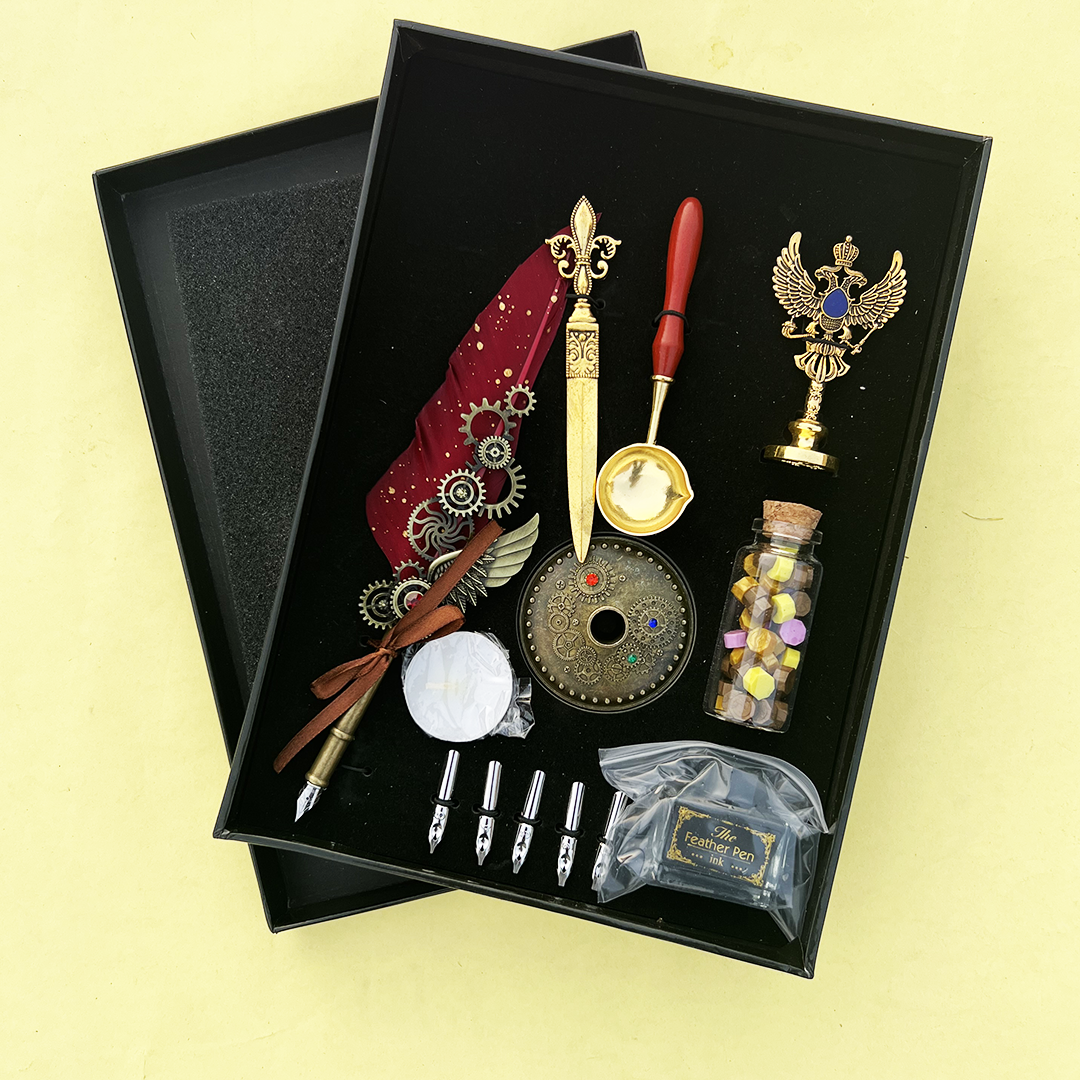 Products:1 feather pen,1 sealing wax,1 wax stamp,1 pen holder,1 bottle of ink, Wax Beats