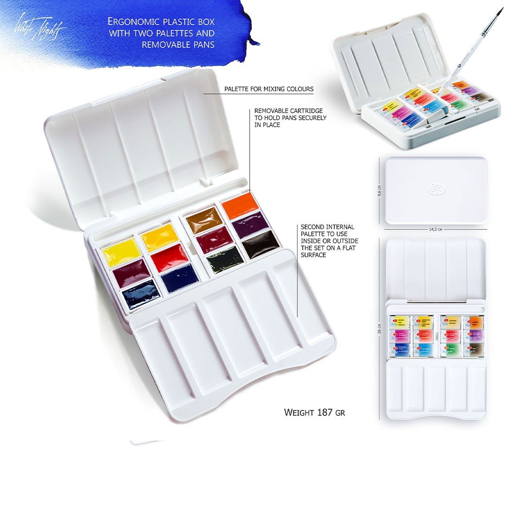 This compact 12-pan set is suitable for use in the studio or for outdoor, plein-air painting. The full-sized pans also makes it easier to pick up colour with brushes of any size. Each set comes packaged with a lightweight plastic palette for convenient colour mixing.