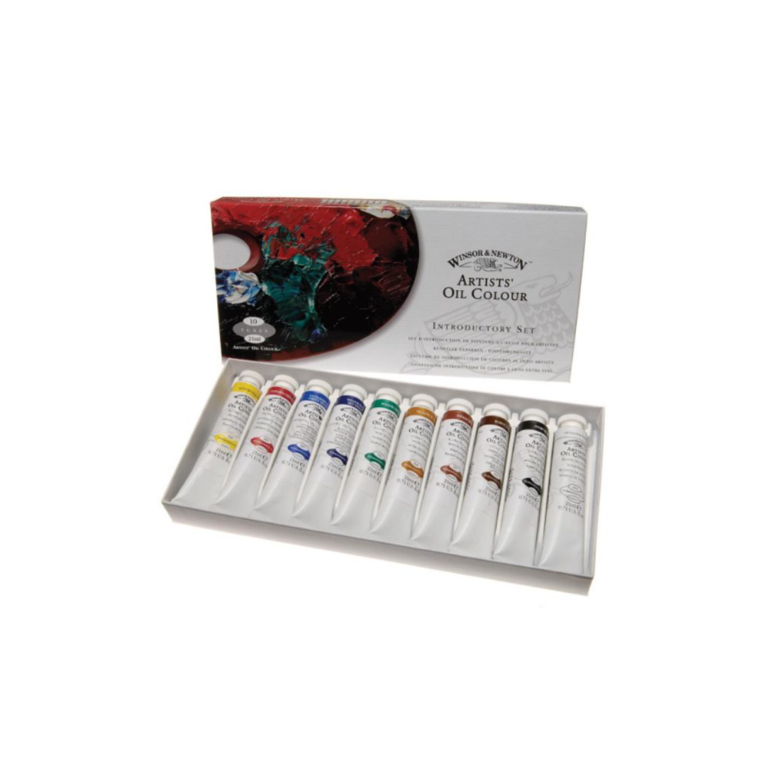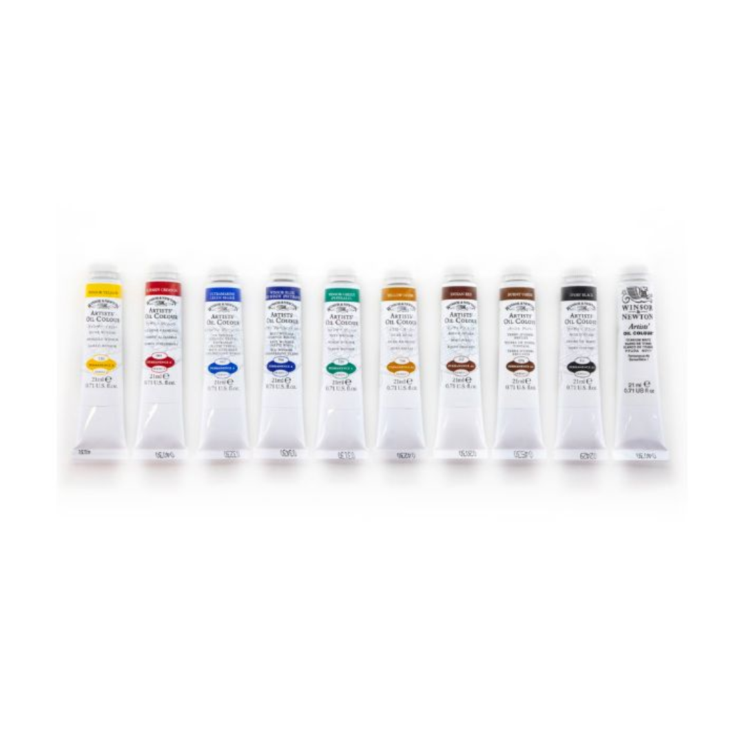 This introductory set contains a larger selection of 10 x 21ml tubes of Artists’ Oil Colour. Includes Winsor Yellow, Crimson Alizarine, Green Ultramarine Hue, Winsor Blue (Red Hue), Winsor Green, Yellow Ochre, Indian Red, Burnt Umber, Ivory Black, Titanium White. Actual contents may vary.