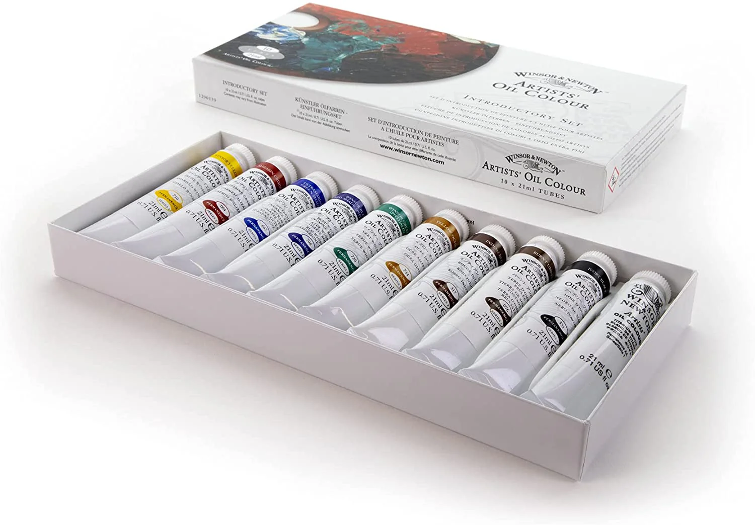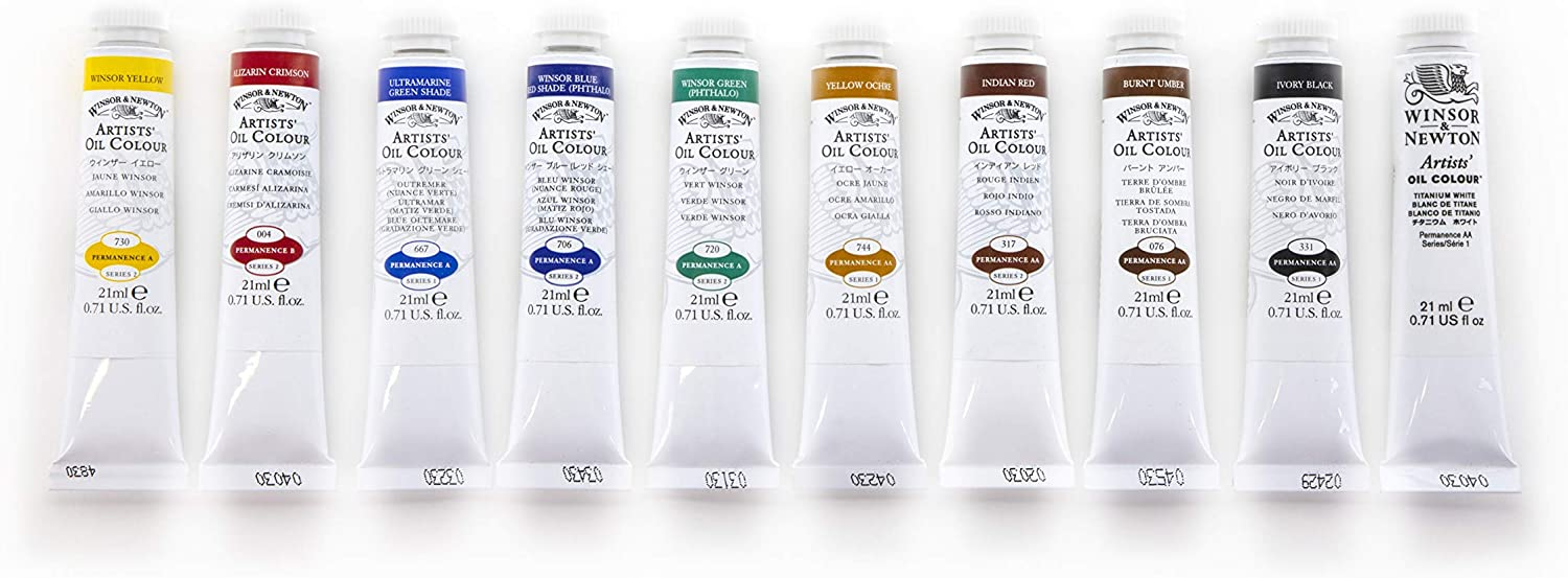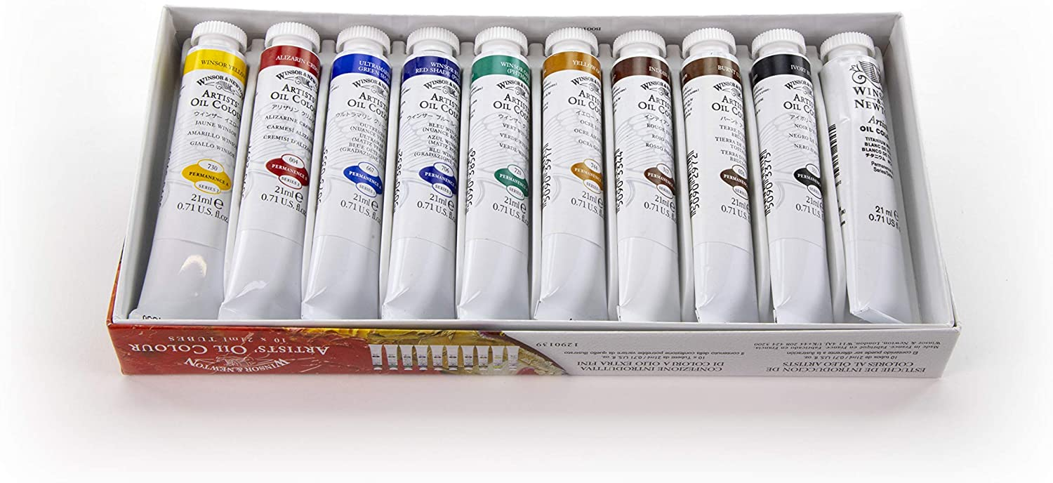 This introductory set contains a larger selection of 10 x 21ml tubes of Artists’ Oil Colour. Includes Winsor Yellow, Crimson Alizarine, Green Ultramarine Hue, Winsor Blue (Red Hue), Winsor Green, Yellow Ochre, Indian Red, Burnt Umber, Ivory Black, Titanium White. Actual contents may vary.