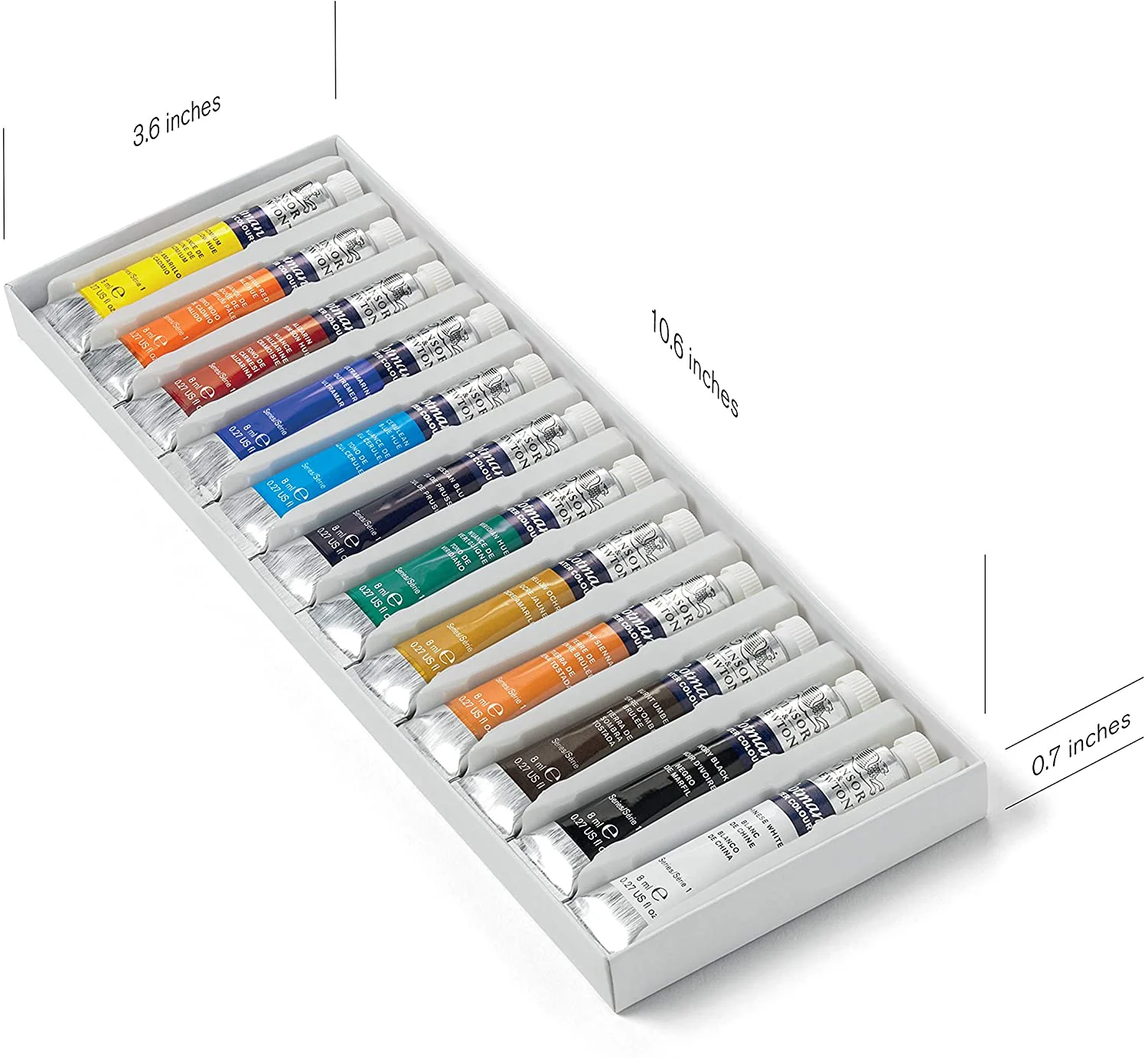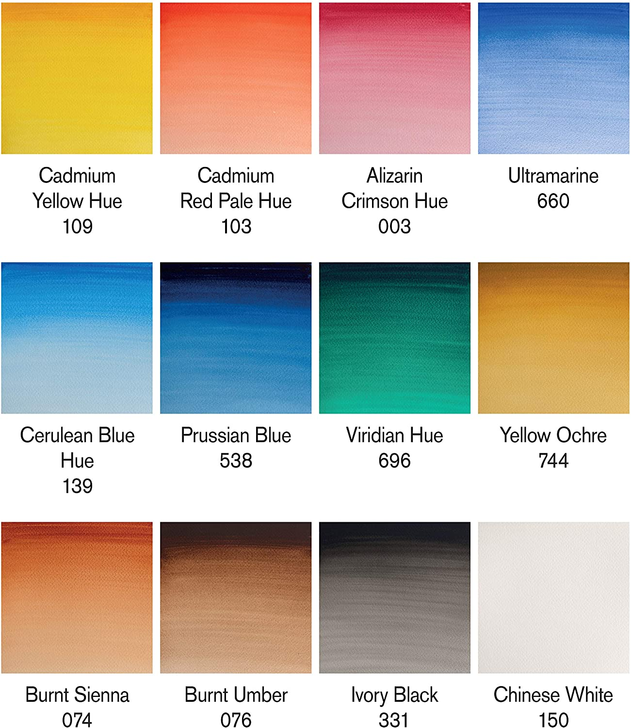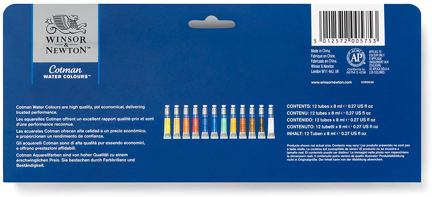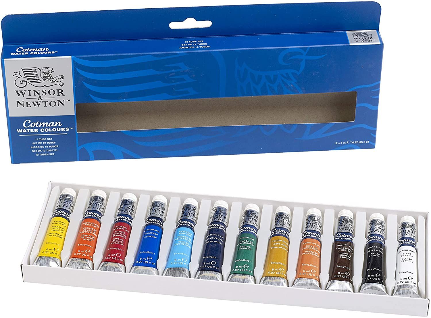 This watercolour set contains twelve Cotman Water Colour 8ml tubes: Cadmium Yellow Hue, Cadmium Red Pale Hue, Alizarin Crimson Hue, Ultramarine, Cerulean Blue Hue, Prussian Blue, Viridian Hue, Yellow Ochre, Burnt Sienna, Burnt Umber, Ivory Black, Chinese White.