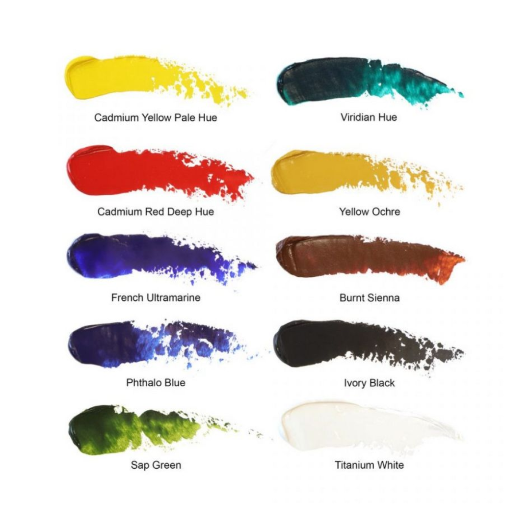 This set contains 10, 1.25 oz (37 ml) tubes, including one each of Cadmium Yellow Pale Hue, Cadmium Red Deep Hue, French Ultramarine, Phthalo Blue, Viridian Hue, Sap Green, Yellow Ochre, Burnt Sienna, Ivory Black, and Titanium White.